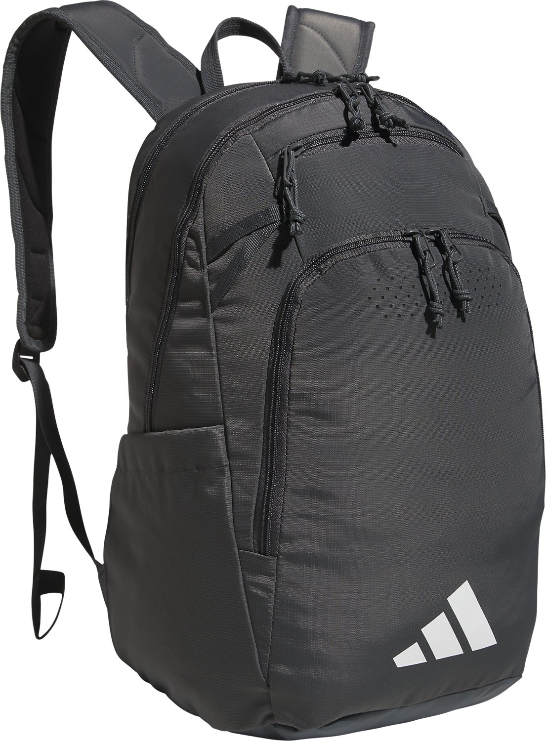 Carry your things to school, practice, or your game with the adidas Defender 5 Backpack. The 100% polyester is extremely durable. Its large main area with multiple zippered pockets offers plenty of space to store important items, and its vented pocket provides an area for dirty clothes. The webbing attachment points allow you to clip keys, a water bottle, or other essentials to the bag.