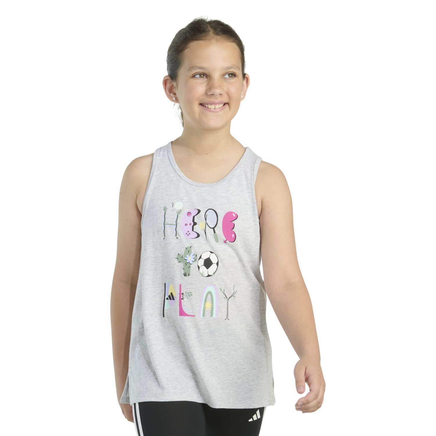 Support your sporty aesthetic with the adidas Girls' Racerback Heather Graphic Tank Top. The cotton and polyester jersey fabric provides a comfortable feel, while the screen-printed design offers a stylish look.