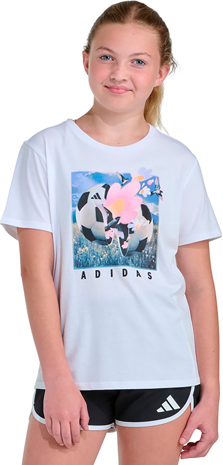 Have your little one looking their best when they wear the adidas Girls' Regular Fit Surreal Soccer T-shirt. It is made of 100% cotton jersey. The short sleeves keep them cool, and its rib-knit crewneck creates a casual look. The optimistic surreal soccer ball poster is screen print with floral and bird elements on the front, adding a playful touch.