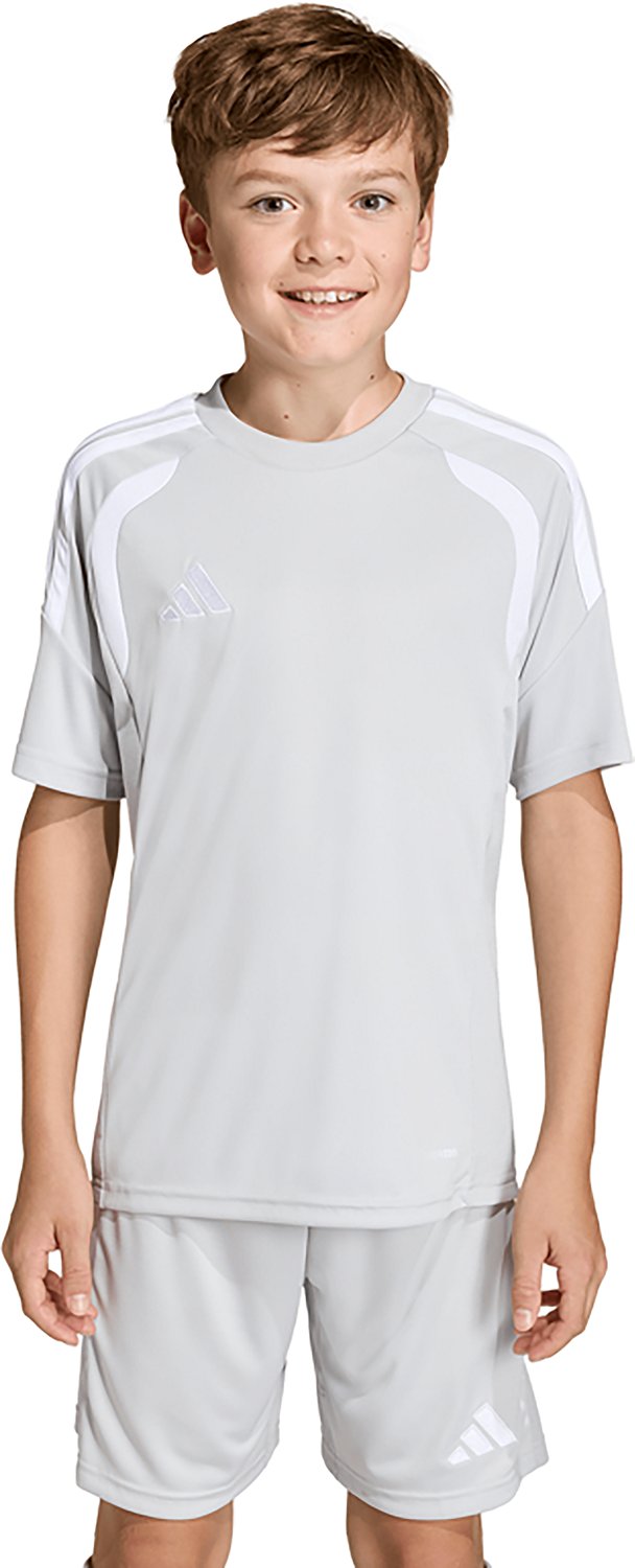 Put on the adidas Kids' Tiro 26 League Soccer Jersey and show your love for the beautiful game. This jersey is made of 100% recycled polyester interlock with Climacool technology and mesh inserts to provide moisture-wicking properties and allow airflow, and its brand details offer athletic touches.