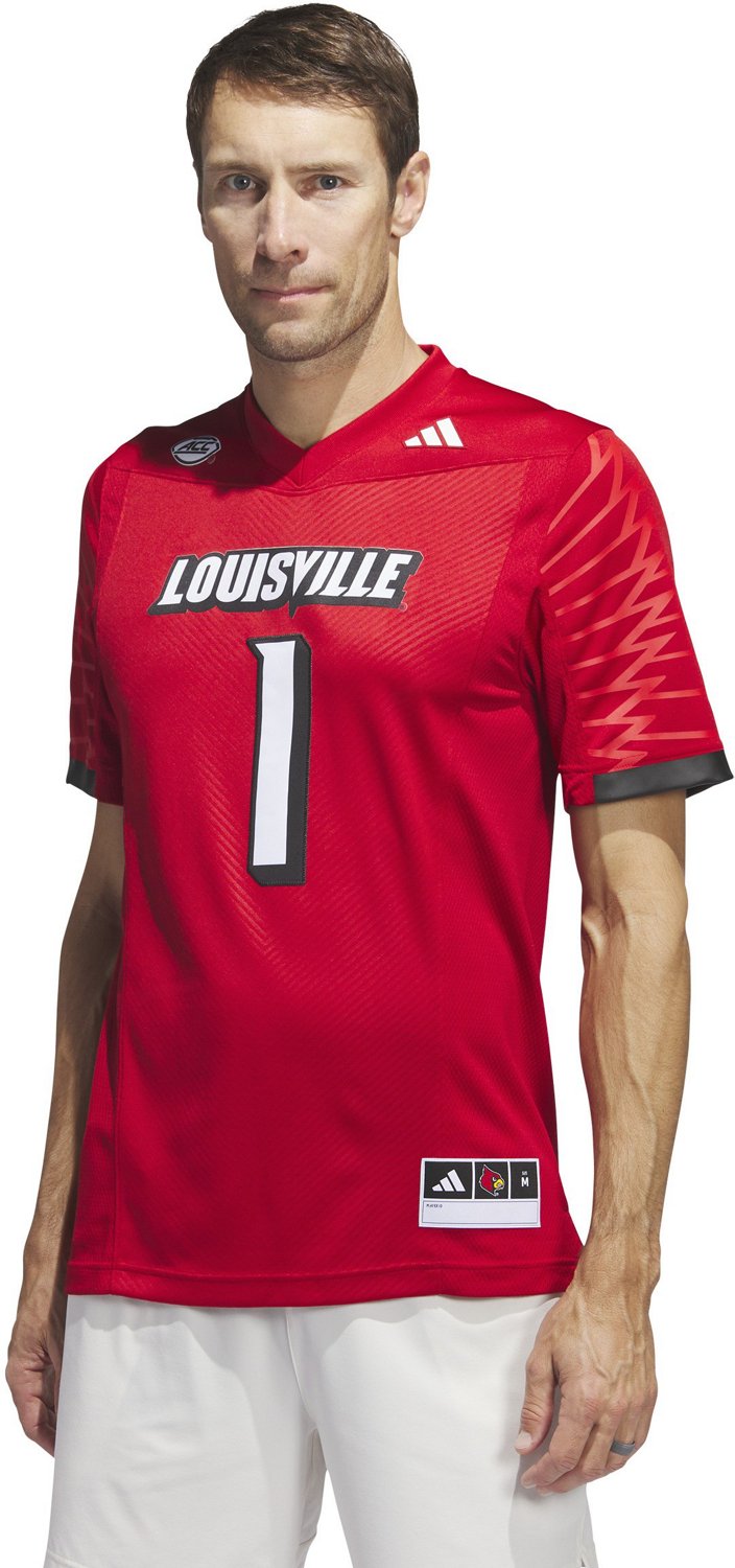 Represent the Cardinals wearing the adidas Men's University of Louisville Home Premier Football Jersey. This jersey is made from recycled polyester fabric for durability and has a screen-printed Louisville team design to show your team spirit.