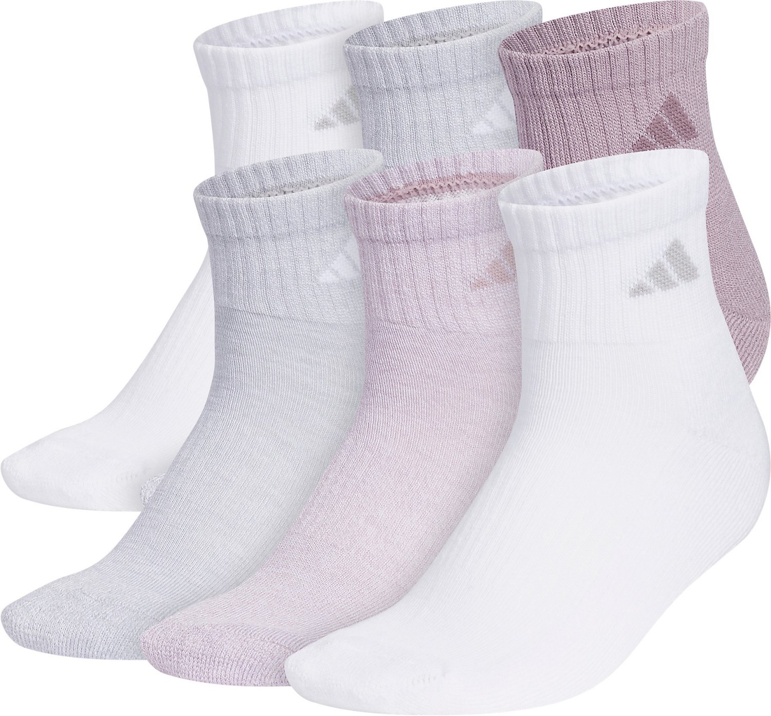 Train hard in comfort wearing the adidas Women's Athletic Cushioned Quarter-Length Socks 6-Pack. The moisture-wicking yarns wick away sweat to keep you cool and dry, and the cushioned feet allow for forgiving steps. The compression arch support offers a secure fit.