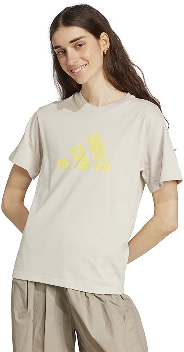 Take on the world in the adidas Women's Camouflage Graphic T-shirt. It is made of 100% cotton. The short sleeves are set in, and its print is camouflage-inspired. The 3 bar logo screen print with a graphic infill on the chest finish off the design.