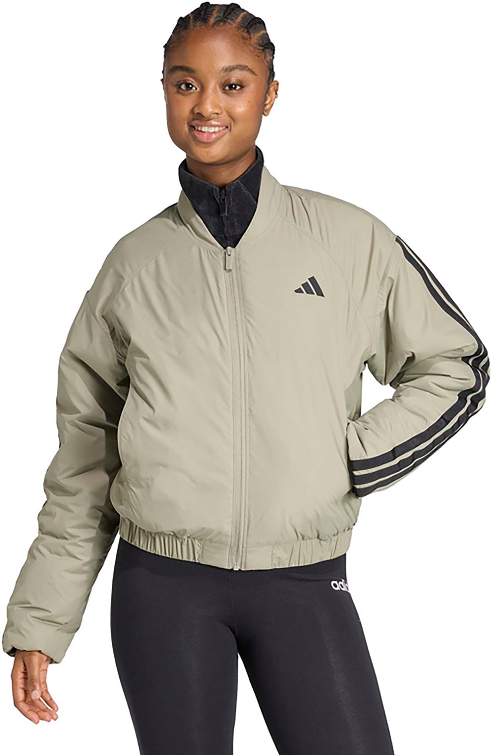 Stay warm with the adidas Women's Essential 3-Stripes Insulated Bomber Jacket. The polyester material provides a comfortable feel, while the CLIMAWARM insulation offers warmth. Built-in water and wind resistance helps keep you dry, and the 3-Stripes design adds a stylish touch.