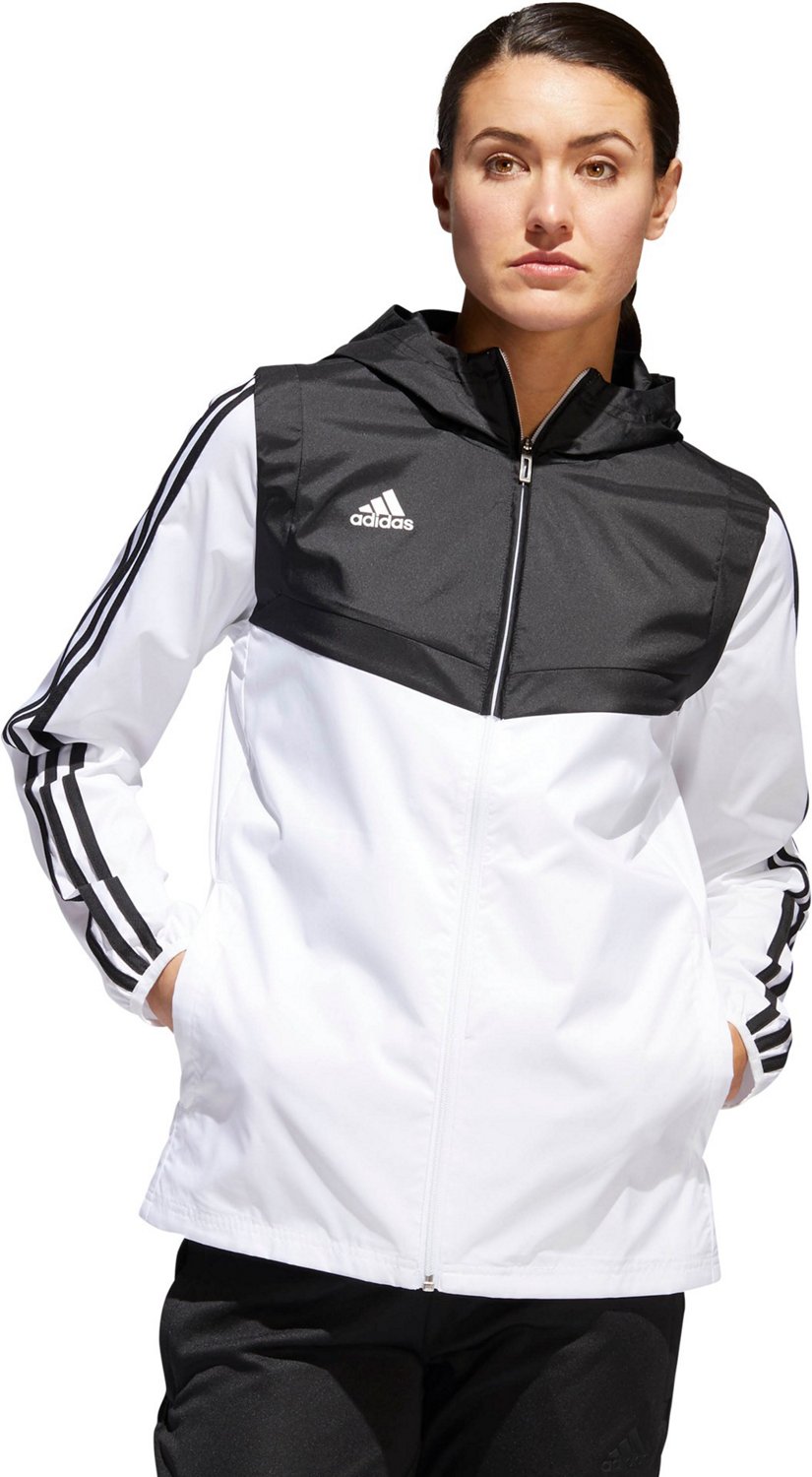 Stay covered on and off the field in the adidas Women's Tiro Windbreaker. This sporty windbreaker is designed with a breathable mesh lining and front zipper pockets. The full-zip closure and 3-panel hood provide plenty of coverage, while the elastic cuffs help keep the sleeves in place.