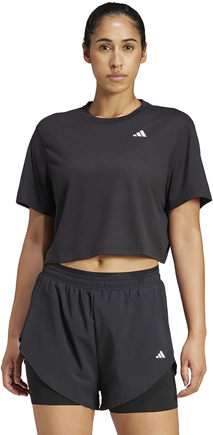 Enhance your workout when you wear the adidas Women's Training Essentials Minimal T-shirt. It is made of 70% recycled polyester and 30% rayon for lightweight durability, and Climacool technology wicks away sweat to help keep you cool and dry during intense workouts. Dropped shoulders create a boxy shape.
