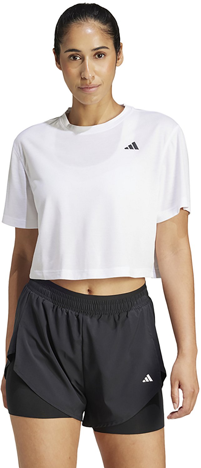 Enhance your workout when you wear the adidas Women's Training Essentials Minimal T-shirt. It is made of 70% recycled polyester and 30% rayon for lightweight durability, and Climacool technology wicks away sweat to help keep you cool and dry during intense workouts. Dropped shoulders create a boxy shape.