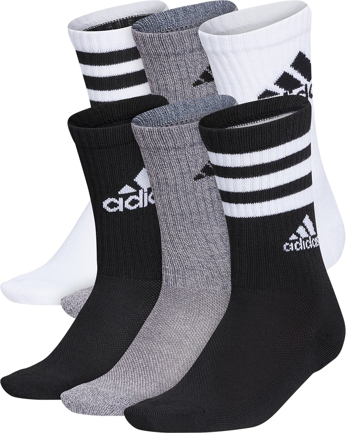 Take on the day in comfort whenever you step into the adidas Youth Cushion Mixed Crew Socks 6 Pack. The polyester and spandex fabric offers a soft, stretchy feel. The mesh tops deliver a breathable, lightweight fit. The moisture wicking yarns help keep your feet dry and comfortable, while the cushioned and reinforced details supply comfort and strength for lasting wear on the go.
