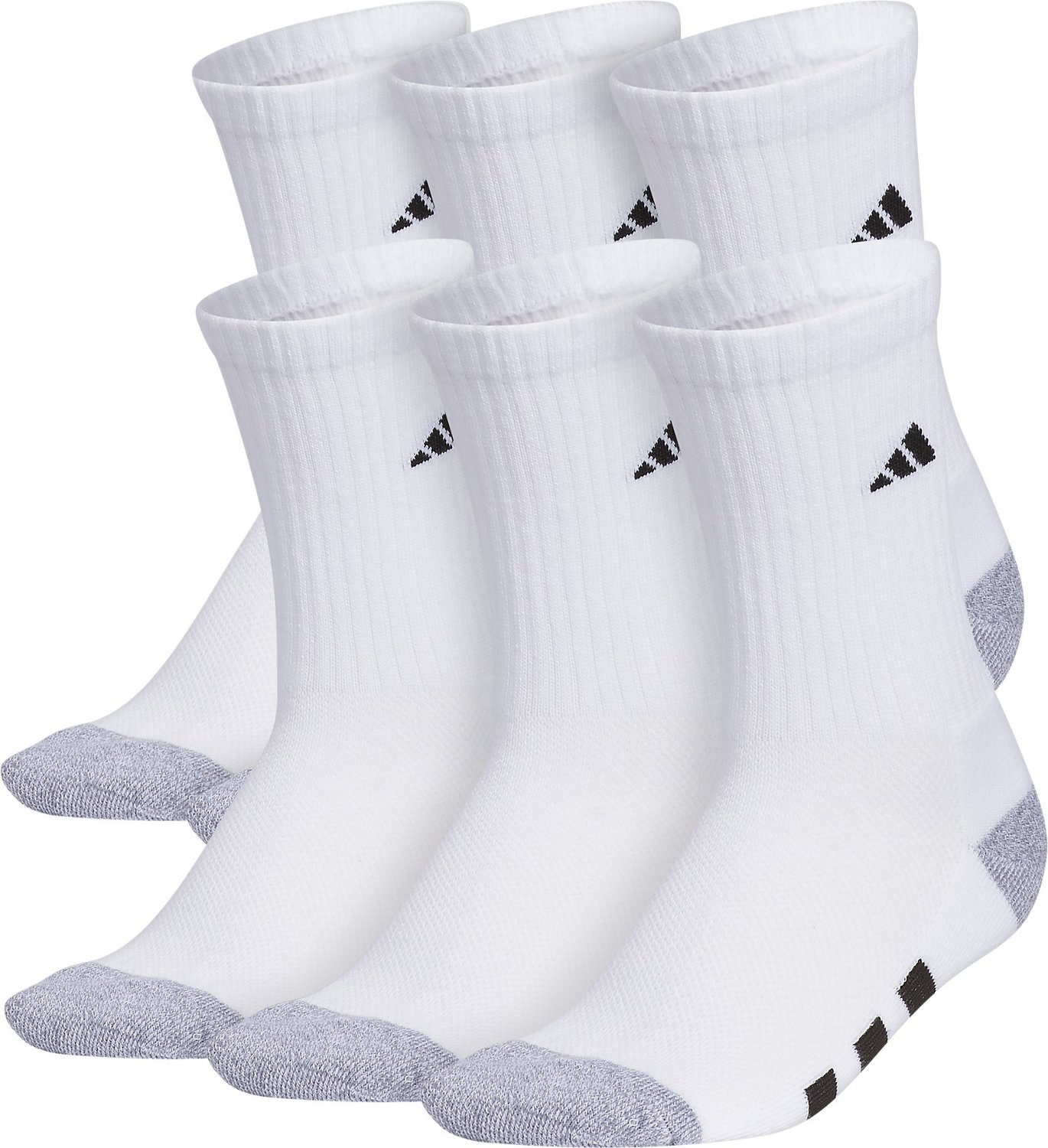 Head to the gym or to practice sporting the adidas Youth Cushioned Crew Socks 6 Pack. The moisture-wicking technology helps your feet stay dry, and a recycled polyester/spandex fabric promotes comfort. The reinforced heels and toes offer resilience in these high-abrasion areas, and the mesh helps circulate airflow to keep you feeling cool.