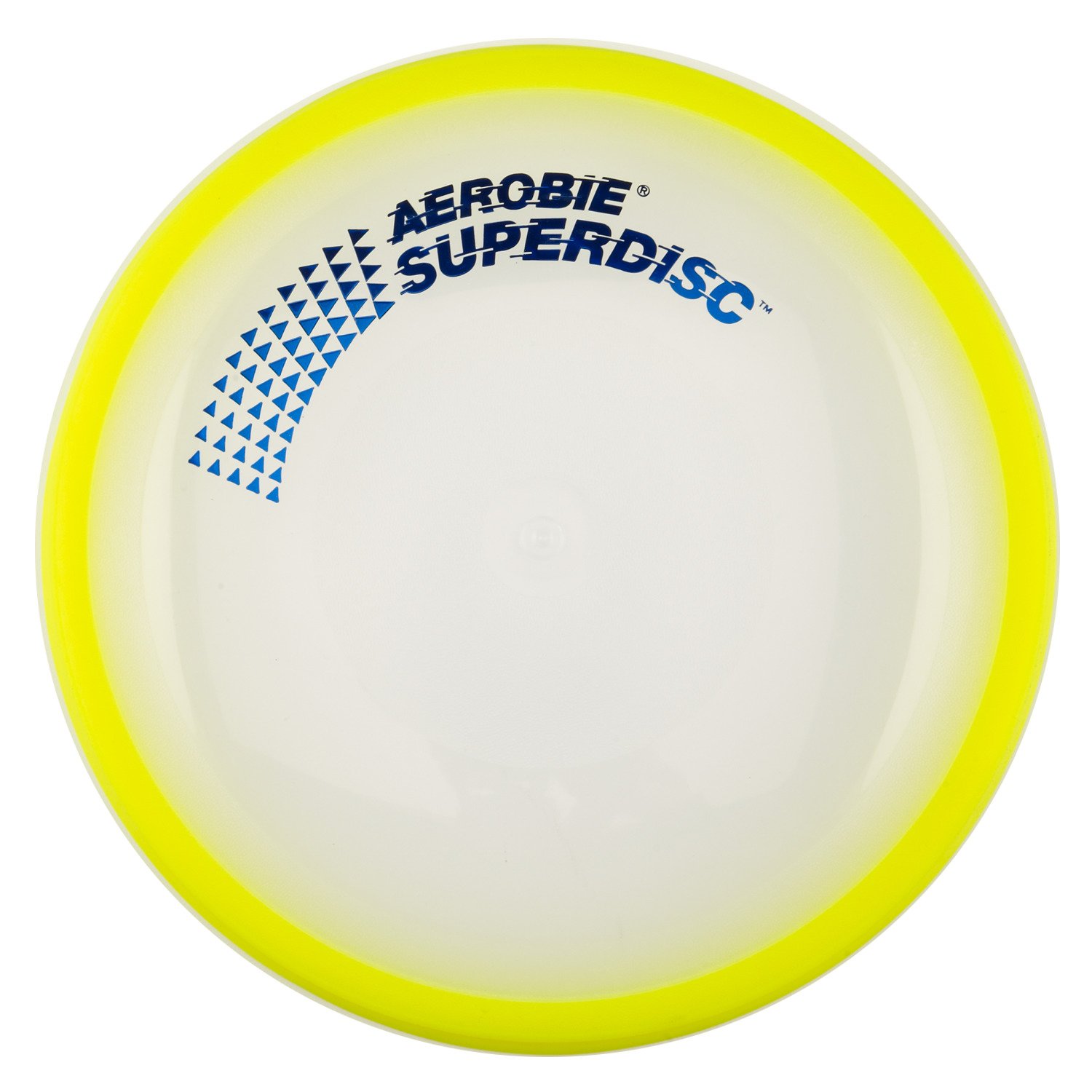 The Aerobie® Superdisc is a 10" flying disc that will provide plenty of fun at your next picnic or barbecue. Made from thermoplastic elastomer, the disc features a rubber ring for extra durability.