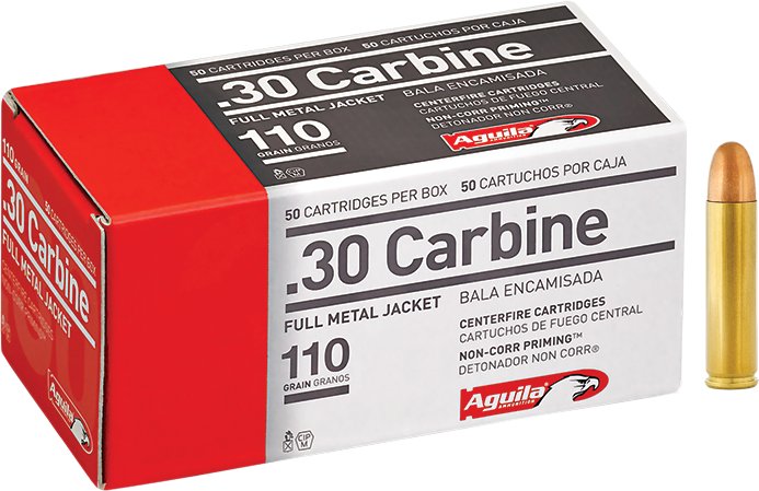 Load up with the Aguila Ammunition .30 Carbine 110-Grain Centerfire Ammunition - 50-Rounds. It has a full metal jacket. The ammunition is equipped with a noncorrosive primer, and it comes in a 50-round box.