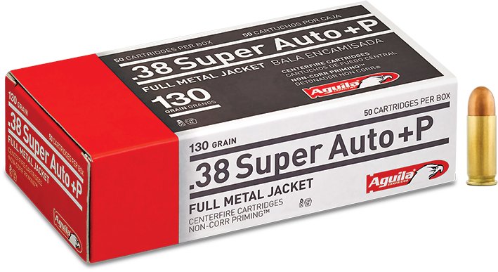 Load up with the Aguila Ammunition .38 Super Auto+P 130-Grain Centerfire Ammunition - 50-Rounds. It has a full metal jacket. The ammunition is equipped with noncorrosive priming, and it comes in a 50-round box.