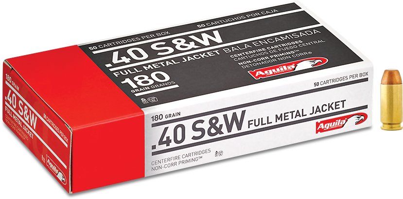 Load up with the Aguila Ammunition .40 S&W 180-Grain Centerfire Ammunition - 50-Rounds. It has noncorrosive priming. The ammunition has a jacketed hollow point, and it comes in a 50-round box.
