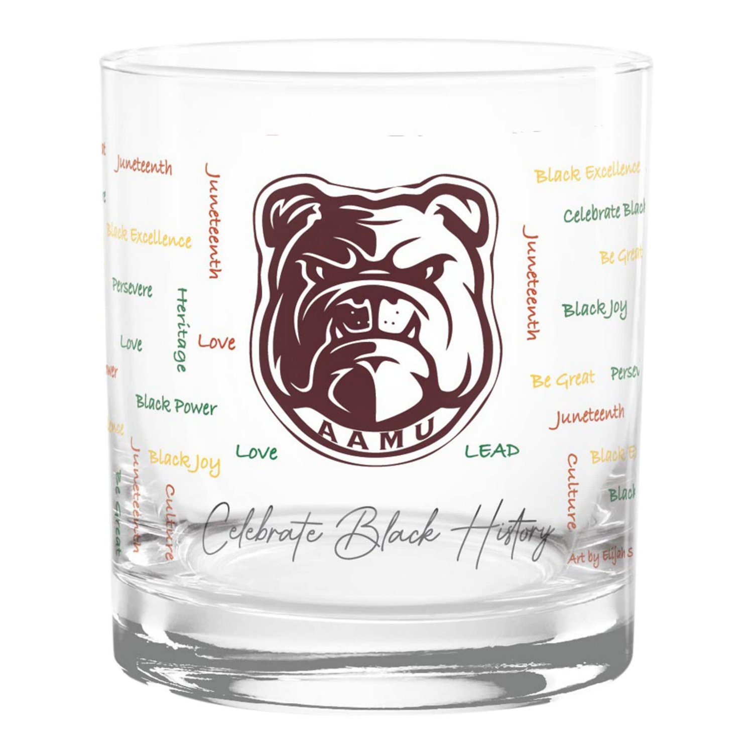 Enhance your drinkware collection with this Alabama AM Bulldogs Black History Month rocks glass HBCU student Elijah Smith designed the graphics on this glass which also features the Alabama AM Bulldogs logo It can hold about 14oz of your preferred beverage of choice perfect for relaxing after a long day