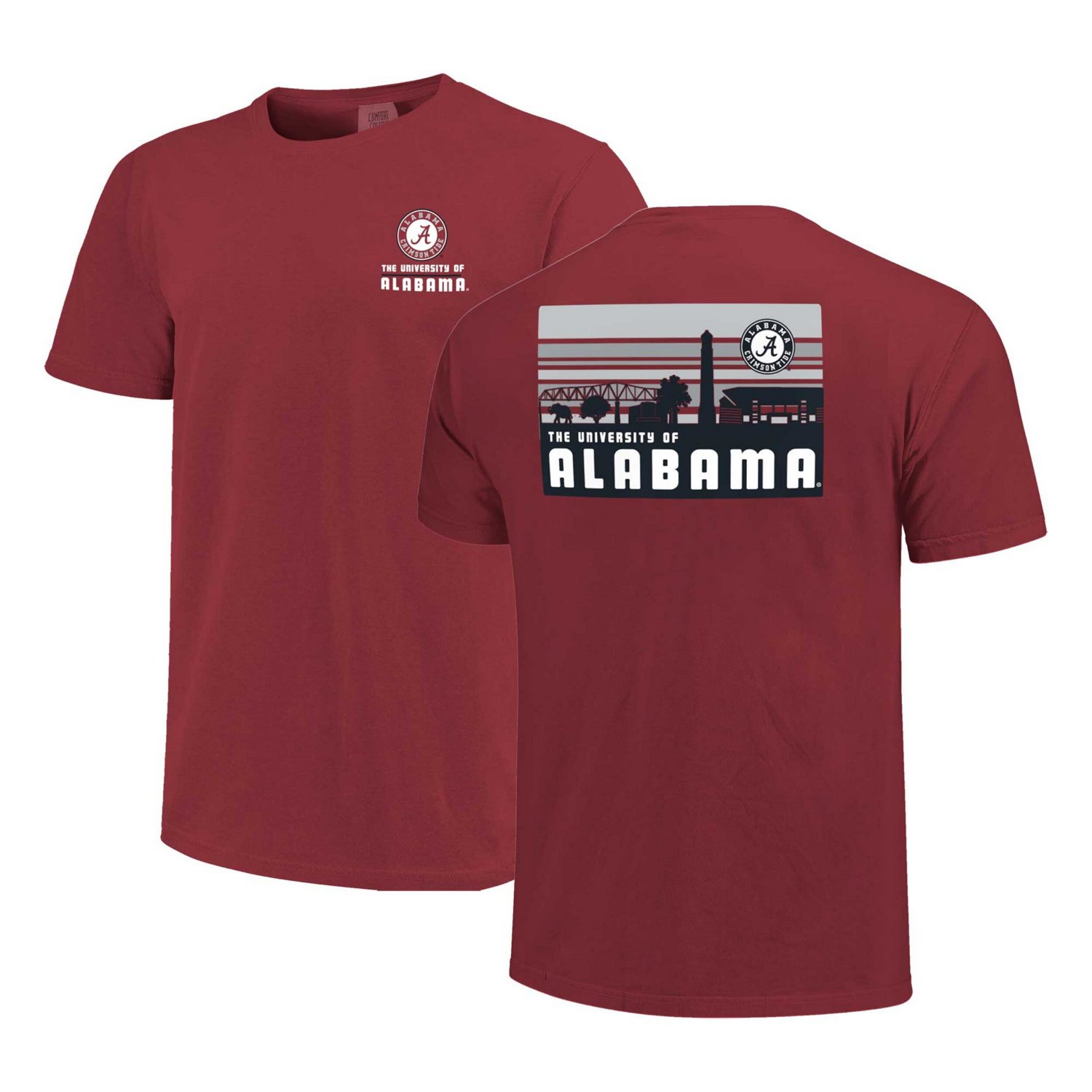 Show off your Alabama Crimson Tide pride with this stylish Striped Campus Skyline T-Shirt This comfortable cotton tee features the school logo and wordmark on the left chest for a touch of Alabama Crimson Tide pride Across the back a silhouette of the campus is set against a striped design creating a unique and eye-catching look