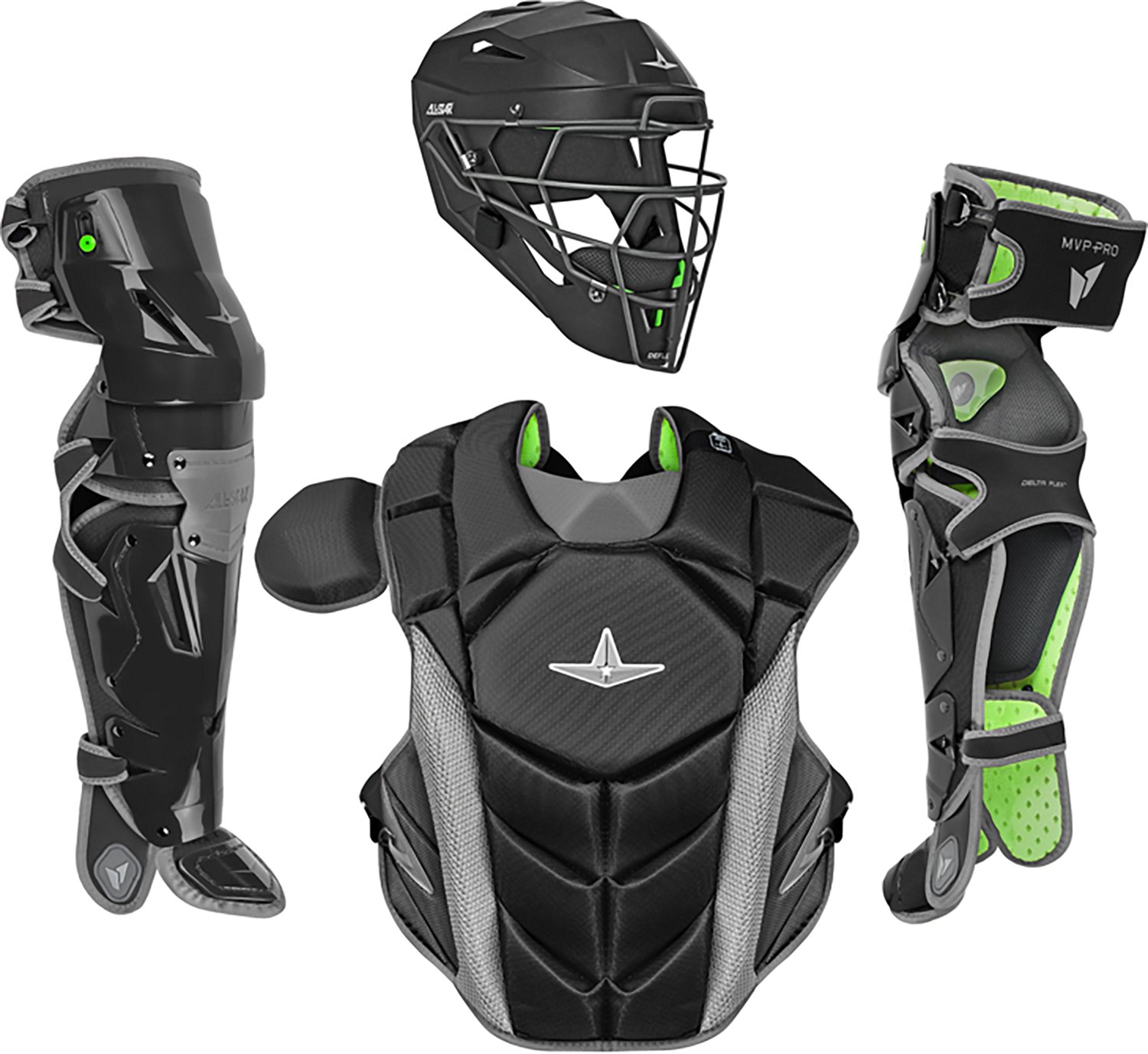 Safeguard your young catcher at home base during games by equipping him in this All-Star Boys' MVP Pro Catching Kit. Its Deflexion® shock hammocks shield his head from baseballs and other impact hazards, while I-BAR-BSP® Back Swing Protection keeps it protected from unintentionally wide swings. The included Leg guards incorporate SHIFT™ technology and a LINQ X™ hinge system, providing reliable coverage for thighs and supporting natural knee flexion.