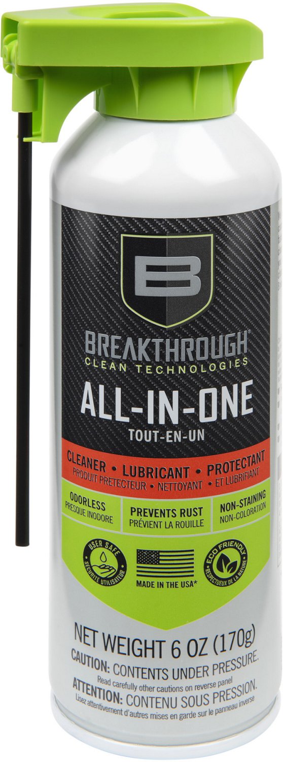 Cleaning your firearm is a breeze with the Allen Company Breakthrough All-in-One 6 oz Aerosol. This aerosol can easily and quickly applies the odorless solution to your firearm. The 3-in-1 solution is designed to clean, lubricate and protect your gun from rust and corrosion, helping it stay in working condition. It conveniently fits inside your hunting or range bag and can also be used on metal, locks, tools and other objects.