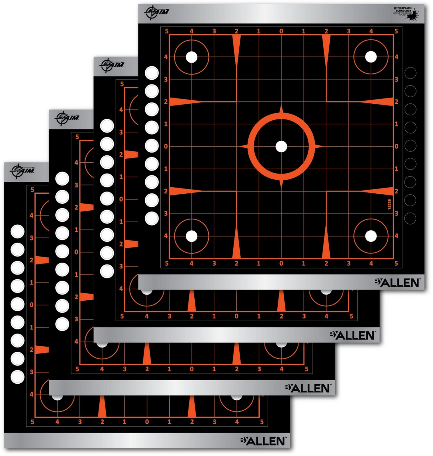 Keep your skills sharp with the Allen Company EZ Aim 12in Splash Reactive Adhesive Sight-In GridPaper Shooting Target 4-Pack. Each target features a classic sight-in grid with high-contrast inks for easy visibility. Splash Technology tracks each shot on impact, providing clear bullet hole visuals to help you maximize consistency. An adhesive backing allows easy attachment to your target stand.