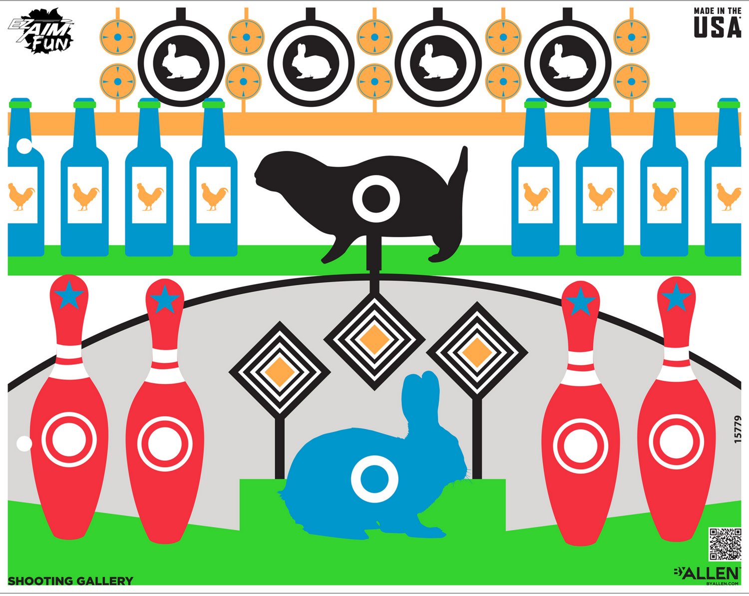 Features a variety of shooting targets, including a rabbit, bowling pins and bottles