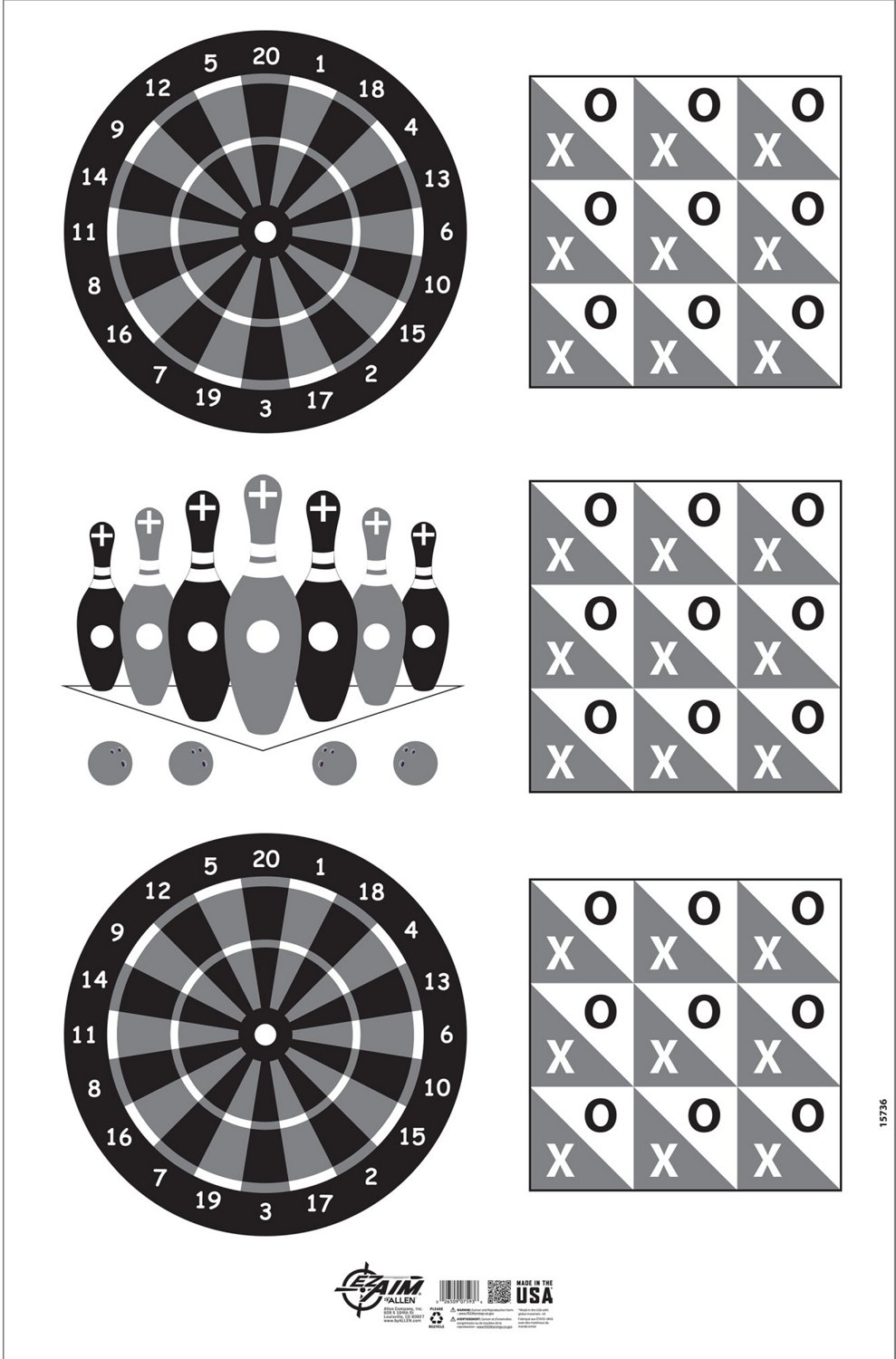 Make practicing shooting fun with the Allen Company EZ Aim Handgun Games Shooting Target and Backer. The target is made of corrugated stock to provide a heavy-duty design, and it features a total of 6 games, including tic-tac-toe, bowling and darts, allowing you to work on your aim.