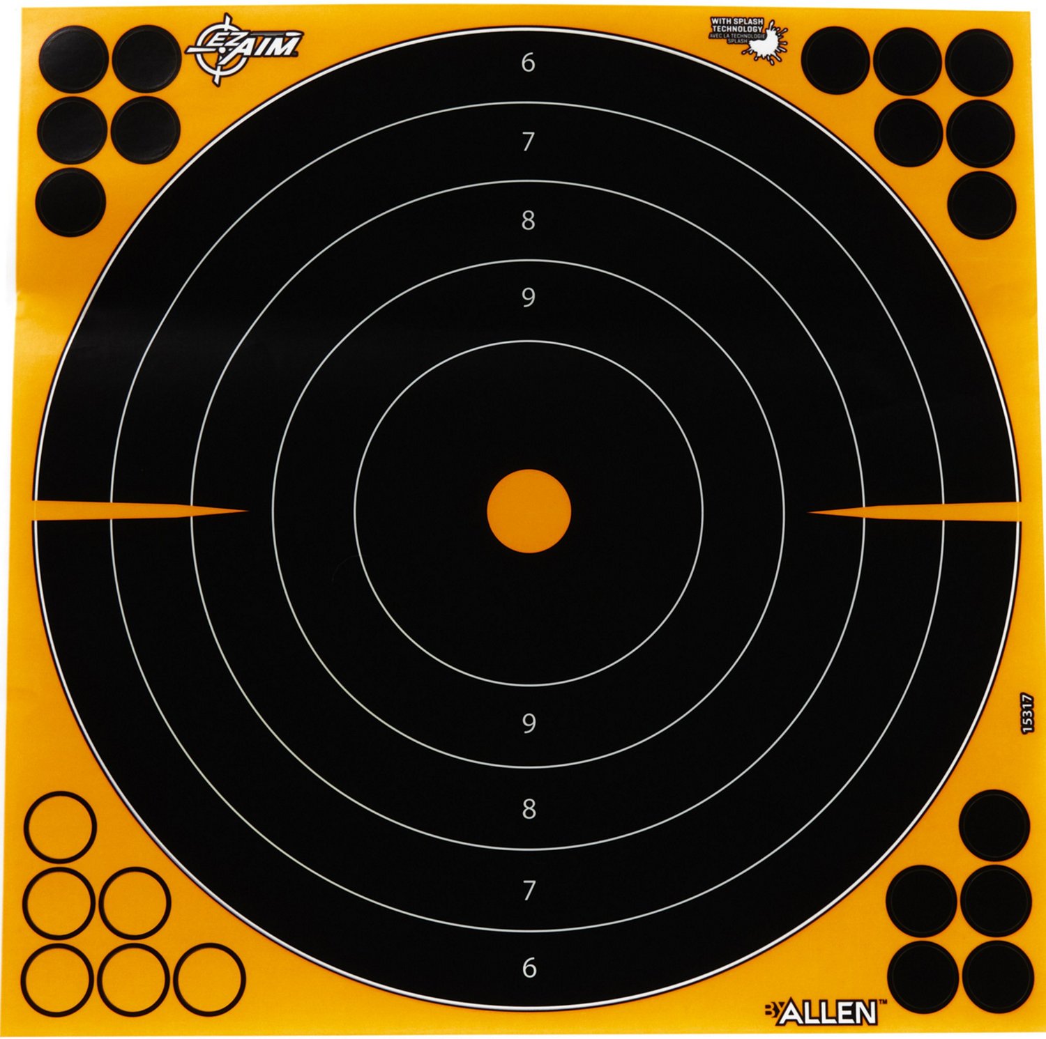 The Allen Company EZ Aim Splash Reactive Adhesive Paper Bullseye Shooting Targets 25-Pack are designed to maximize your accuracy. The adhesive backs allow you to stick the targets easily to cardboard plywood and steel surfaces, and the Splash Technology provides bright yellow impact holes to see where your shots land. The flaking paper helps you improve your aim by seeing where you shoot instantly.