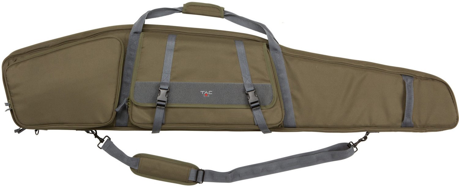 Your rifle will be safe in the Allen Company Tac-Six Garrison 55 in Rifle Case. The 600-denier polyester lining with an adjustable strap system and a padded interior helps keep your rifle safe and stable during transport, and the front flap pocket with lashing straps and a rear zippered pocket provide added room for your mags and shooting gear. A hanging loop with a D-ring lets you hang your rifle when it is not in use, and the adjustable/removable shoulder strap and nose grab strap offer various ways to carry your rifle.