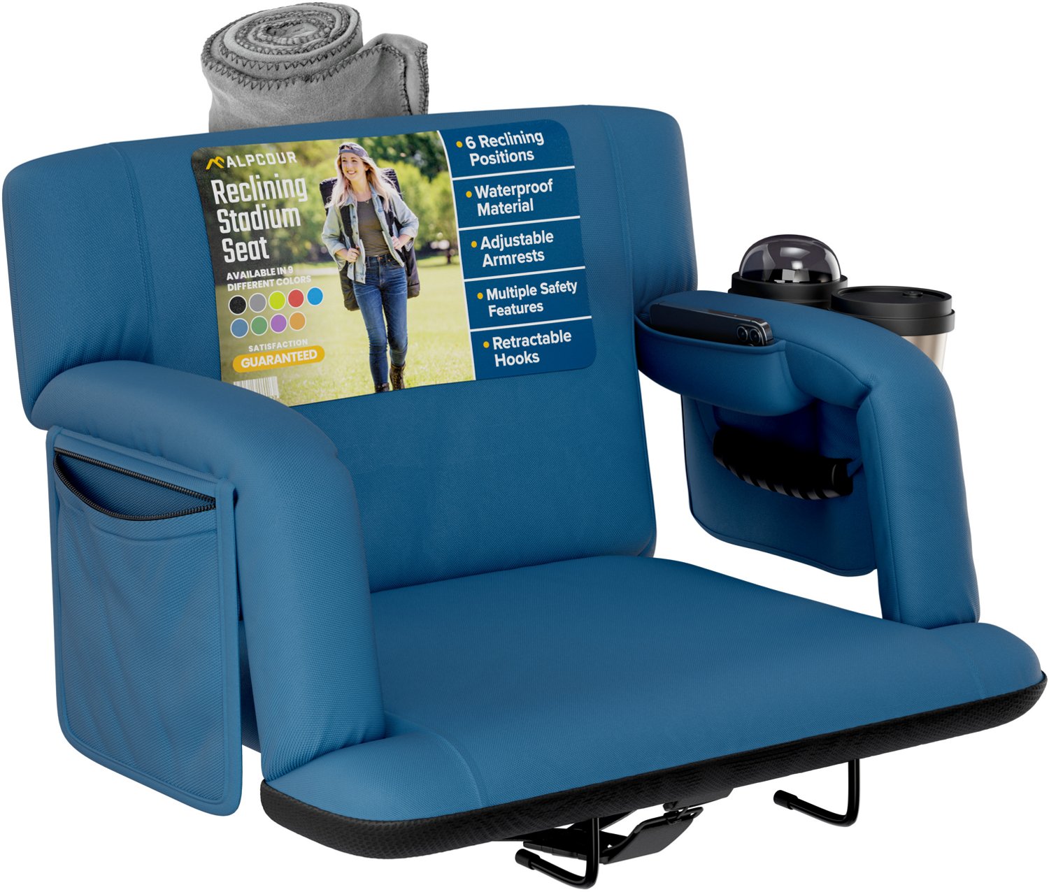 Relax anywhere with the Alpcour Premium Reclining Extra Wide Stadium Seat. You can take your chair to the stadium, park beach, or campsite and last the entire match without any pain. The 600D polyester is waterproof, allowing you to relax in any environment, and it converts from upright to flat in just 6 steps. The 2 durable straps sling over your shoulders for hands-free transport.