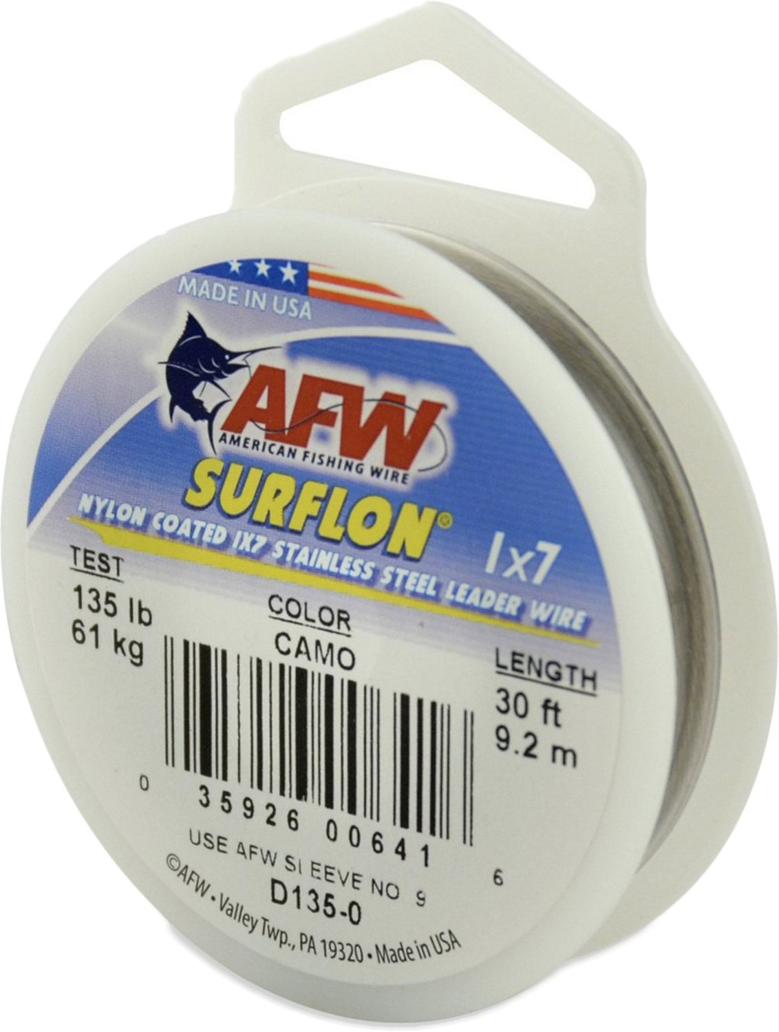 The American Fishing Wire Surflon 40 lb. - 30' Leader Wire is made of stainless steel with a nylon-coating for improved durability and longevity of the wire to abrasion and fraying. Camo pattern.