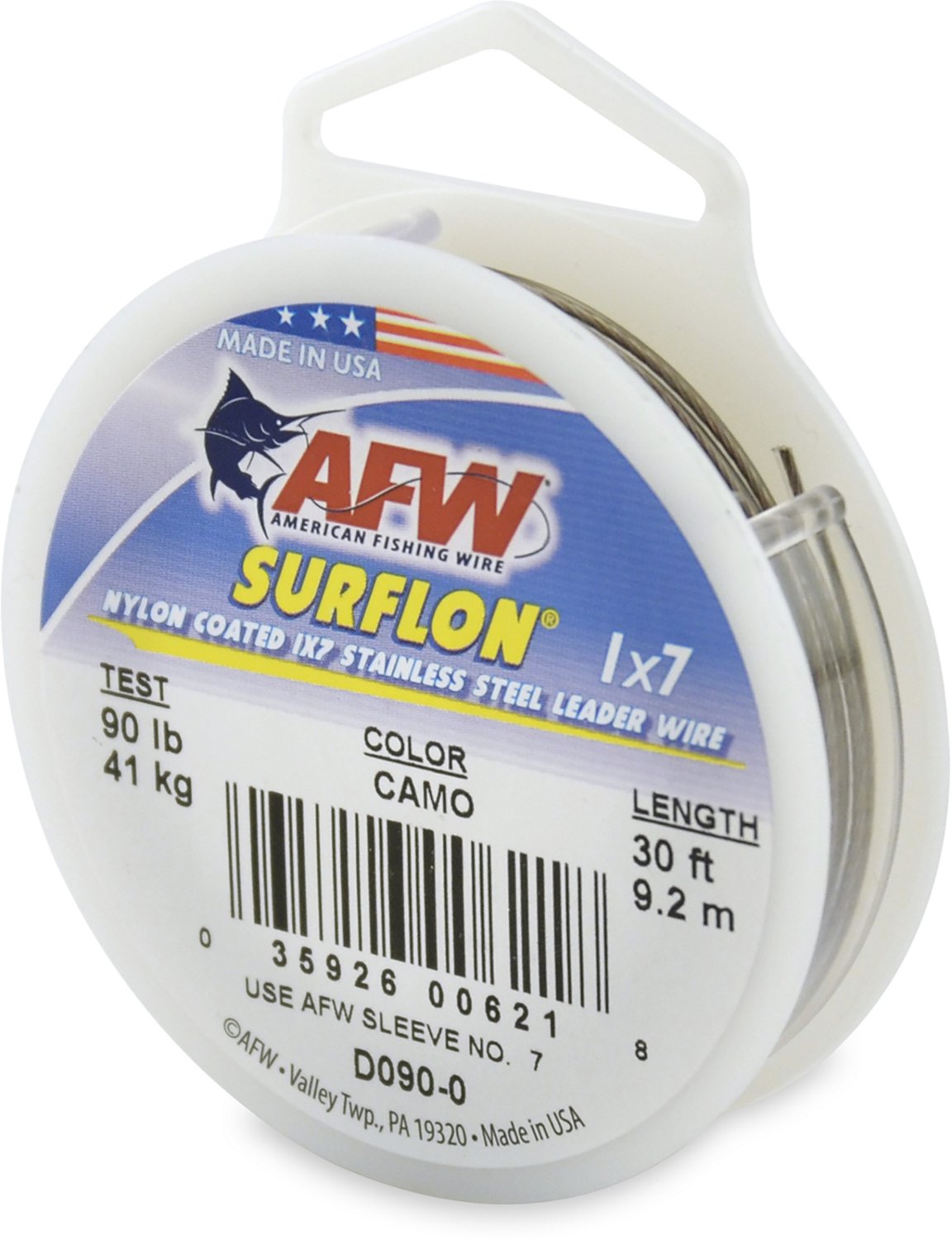 The American Fishing Wire Surflon 90 lb. - 30' Leader Wire is made of stainless steel with a nylon-coating for improved durability and longevity of the wire to abrasion and fraying. Camo pattern.