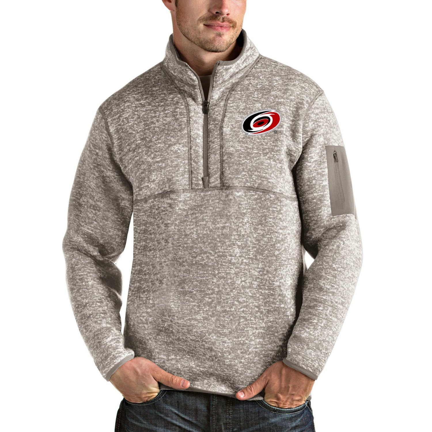 Stay warm and show your Carolina Hurricanes spirit with this Antigua Fortune Half-Zip Pullover Jacket This Carolina Hurricanes pullover features a brushed back heather sweater knit for comfort and warmth The embroidered graphics and welded sleeve pocket add a touch of style while the binding at the collar cuff and bottom hem ensures a snug fit Whether you're cheering on the Hurricanes from the stands or watching from home this pullover will keep you warm and stylish all season long