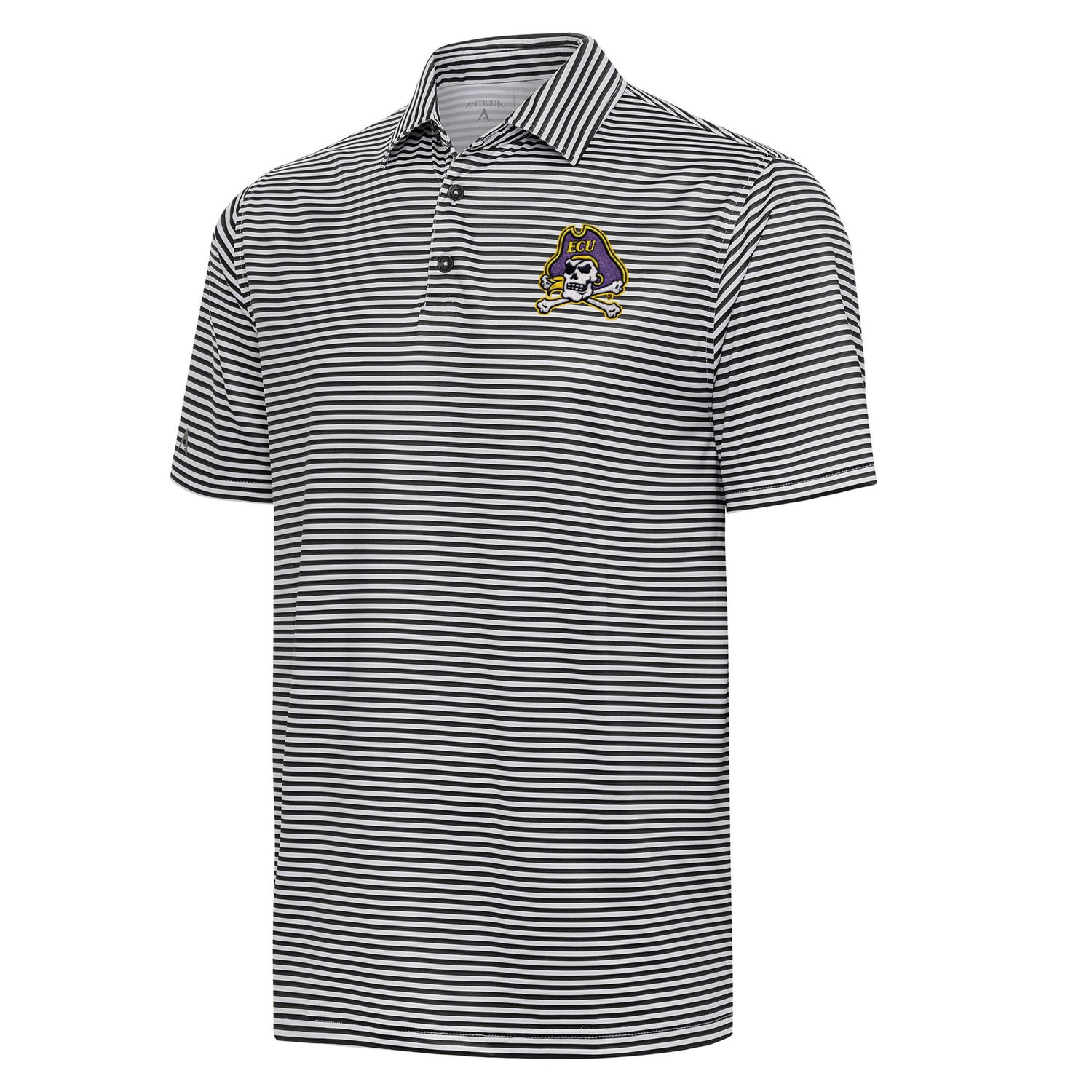 The Men's Antigua Black ECU Pirates Skills Polo is a stylish and comfortable choice for any ECU Pirates enthusiast Its sublimated stripe pattern and heat-sealed graphics add a touch of sophistication while the self-fabric collar and hem vents ensure a secure and relaxed fit Made from durable polyester and spandex this polo is perfect for showing your support for the ECU Pirates both on and off the field
