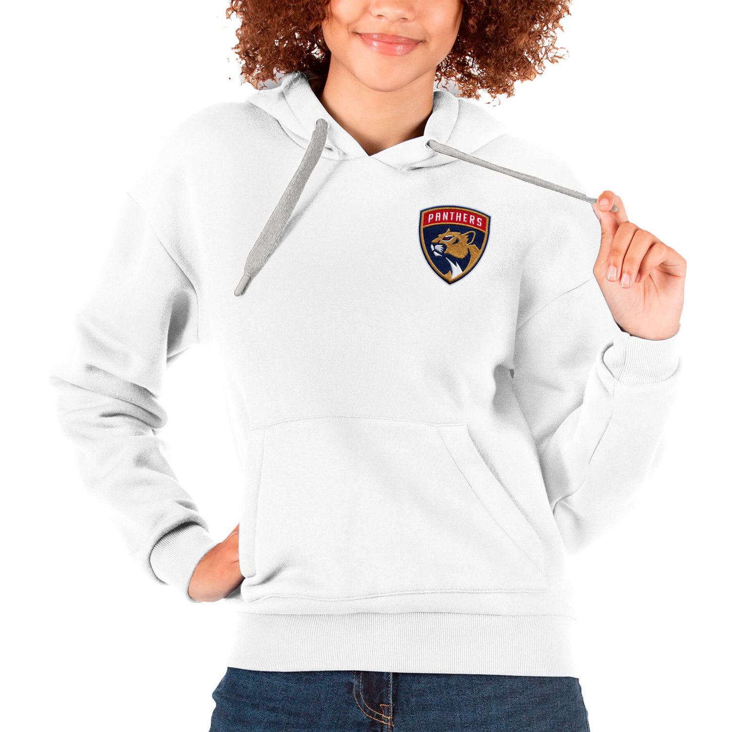 The Women's Antigua White Florida Panthers Primary Logo Victory Pullover Hoodie is the perfect way to show your support for the Florida Panthers Made from a comfortable cotton and polyester blend this lightweight hoodie features embroidered graphics that proudly display your team pride Front pouch pockets provide a convenient place to store essentials while the drawstring hood keeps you warm and comfortable Whether you're cheering on the Panthers at the game or relaxing at home this hoodie is sure to become a favorite