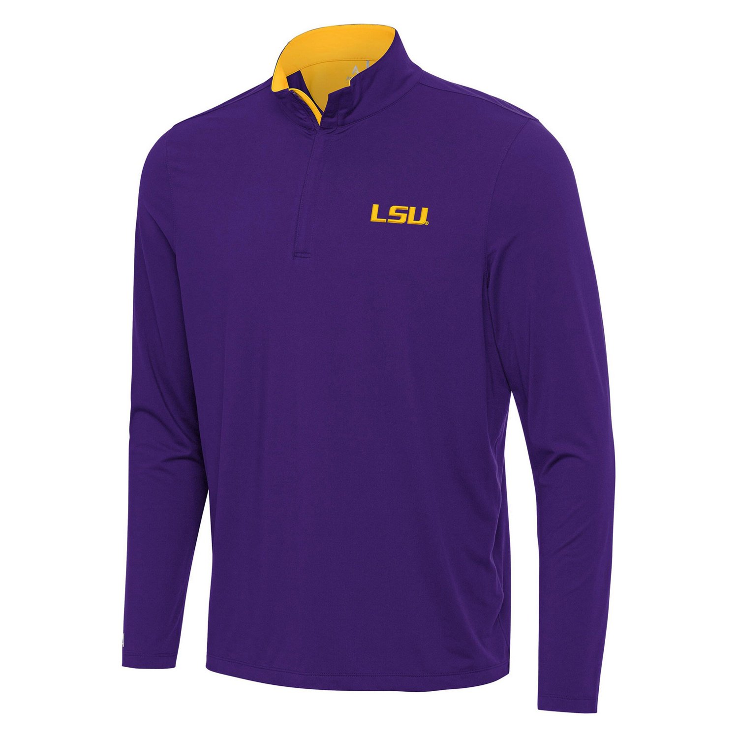 Add some LSU Tigers spirit to your wardrobe with this Antigua Content Quarter-Zip Pullover Top This lightweight pullover top is made from a blend of polyester and spandex brushed jersey fabric for a comfortable flexible fit that moves with you The embroidered LSU Tigers logo patch on the left chest and contrast-color detailing add a touch of style to your game day look