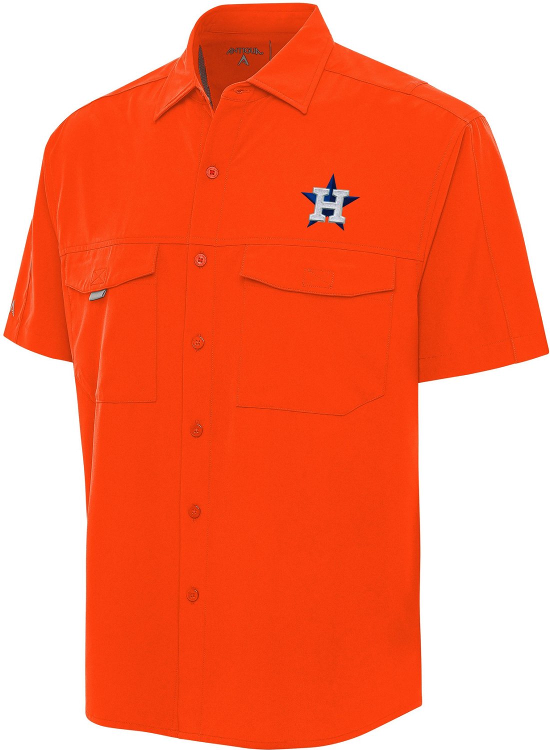 Rep your team when fishing with the Antigua Men's Houston Astros Pinch Hitter Woven Fishing Button-Down Shirt. This button-down is made from 100% polyester woven fabric for comfort and durability. The vertical openings at the back and mesh lining allow for increased ventilation, while the embroidered Astros team logo on the left chest shows team spirit.