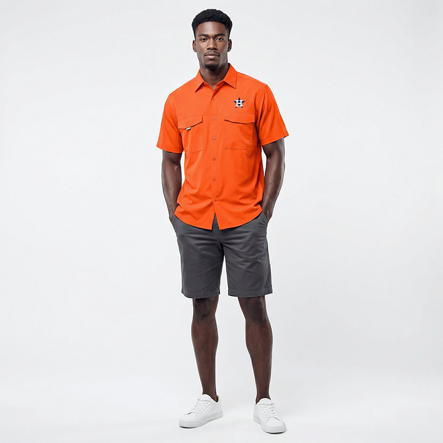 Rep your team when fishing with the Antigua Men's Houston Astros Pinch Hitter Woven Fishing Button-Down Shirt. This button-down is made from 100% polyester woven fabric for comfort and durability. The vertical openings at the back and mesh lining allow for increased ventilation, while the embroidered Astros team logo on the left chest shows team spirit.