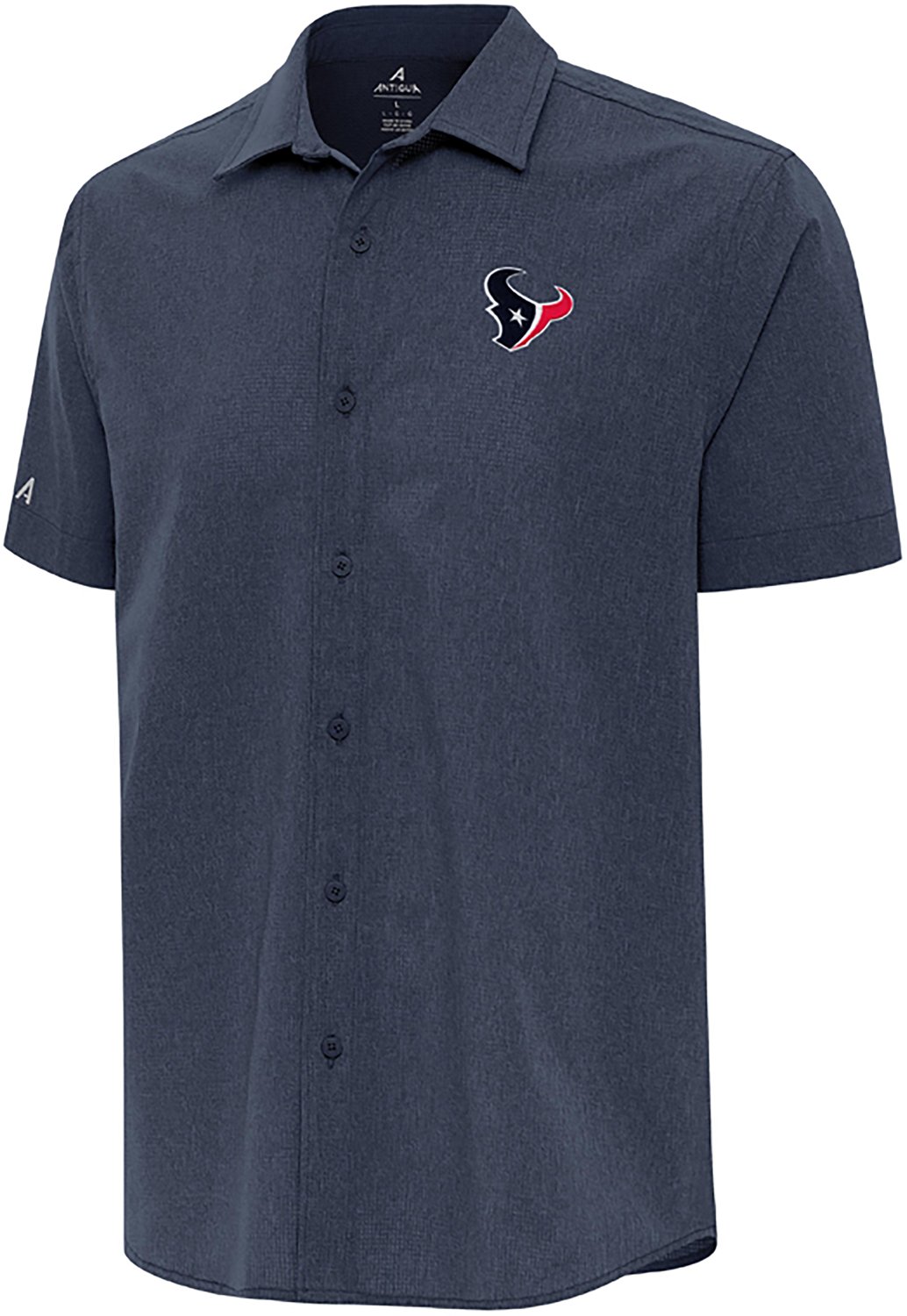 Represent your team and get active in this Antigua Men's Houston Texans Activate Short Sleeve Woven Shirt. It is made of 100% polyester for durability, and the shirt has a back vent to help keep you cool. Features a Houston Texans logo on the chest.