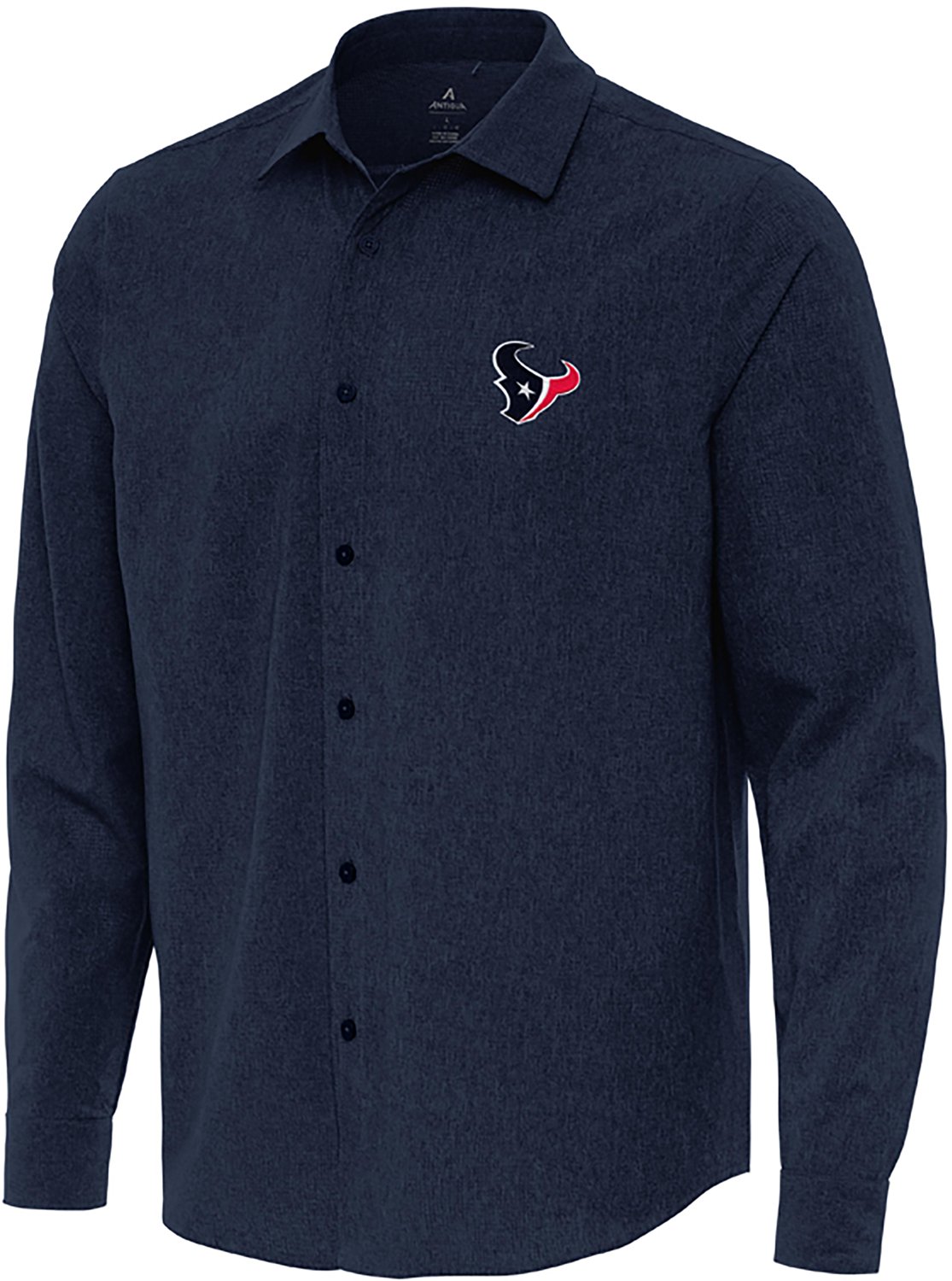 Class up your gameday look without sacrificing comfort in this Antigua Men's Houston Texans Exposure Long Sleeve Woven Shirt. It is made of 100% polyester for durability, and the shirt features micro ventilation to help keep you cool. Features a Houston Texans logo on the chest.