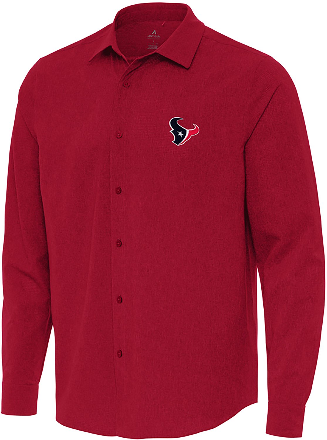 Class up your gameday look without sacrificing comfort in this Antigua Men's Houston Texans Exposure Long Sleeve Woven Shirt. It is made of 100% polyester for durability, and the shirt features micro ventilation to help keep you cool. Features a Houston Texans logo on the chest.