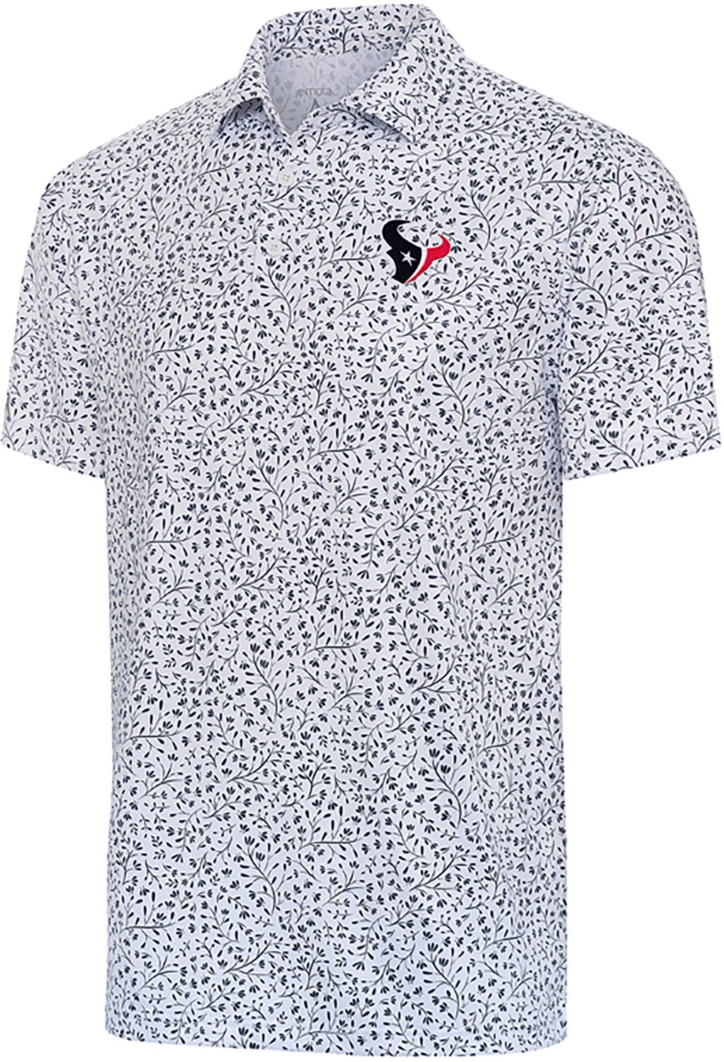 Hit the green and support your team in the Antigua Men's Houston Texans Motion Polo Shirt. It is made of 94% polyester and 6% spandex. The matte jersey fabric is decorated with a sublimated floral print, and its self-collar band and hem vents improve breathability. The matte buttons add a unique touch.