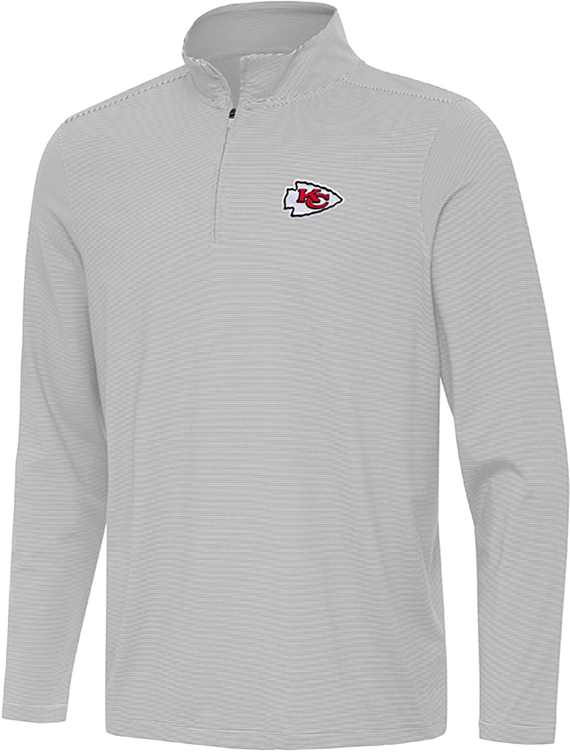 Display your team spirit in style with this Antigua Men's Kansas City Chiefs Twine 1/4 Zip Pullover. It is made of 92% polyester and 8% spandex for durability and a flexible fit, and the pullover is designed with a mini stripe pattern for an attention-grabbing look. Features a Kansas City Chiefs logo on the chest.