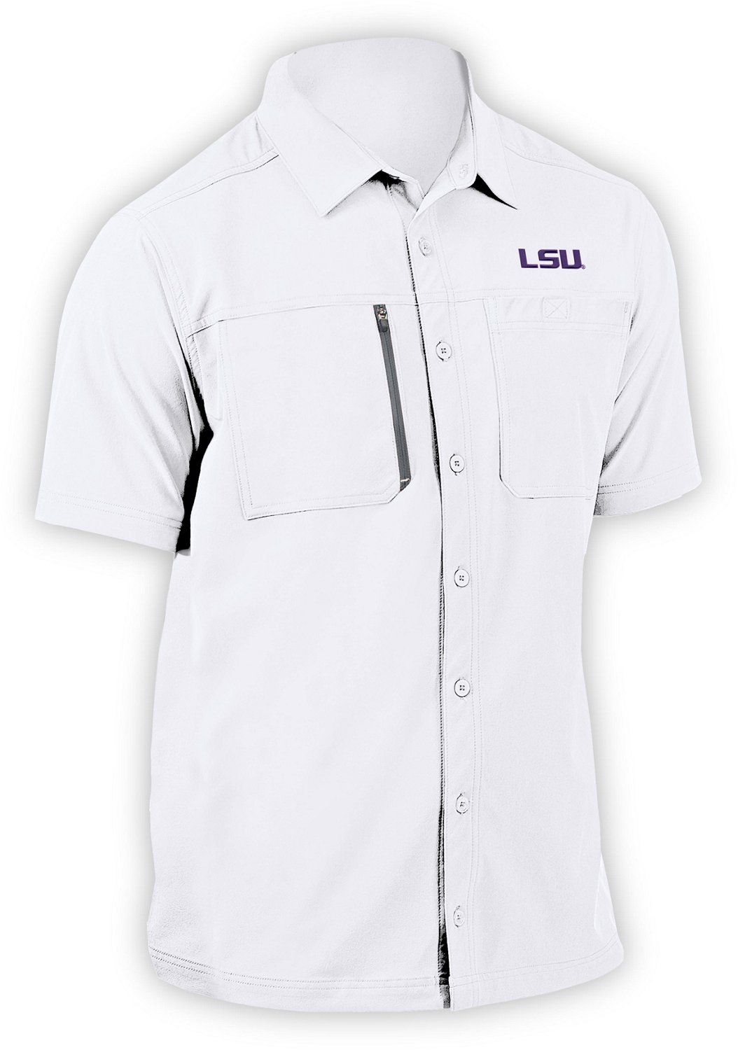 Represent the Tigers in comfort on the water with the Antigua Men's Louisiana State University Kickoff Woven Short Sleeve Fishing Shirt. The polyester stretch woven fabric offers comfort for the whole day, and the chest pockets provide convenient space to store your belongings. The LSU design displays your love of the team, and the back yoke vent provides comfortable airflow.