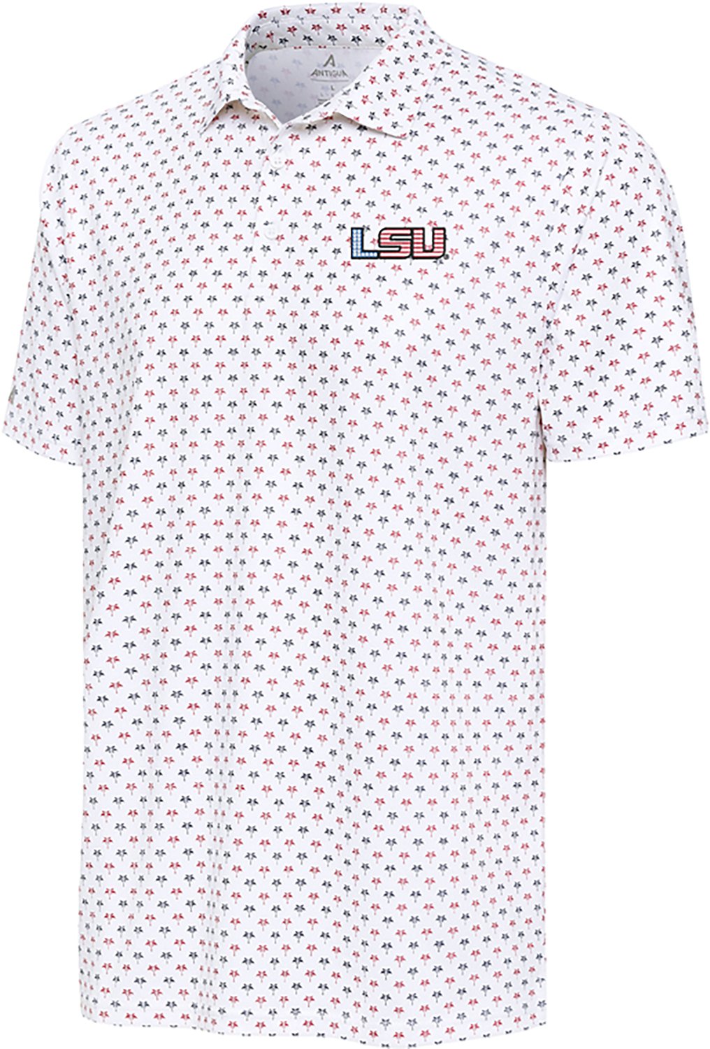 Highlight your fandom by wearing the Antigua Men's LSU Ameri Kona Polo Shirt. This polo is made of 94% polyester and 6% poly sheen fabric to help provide a soft and cozy feel, and it features a team design over a palm tree pattern for a summery style fans will love.
