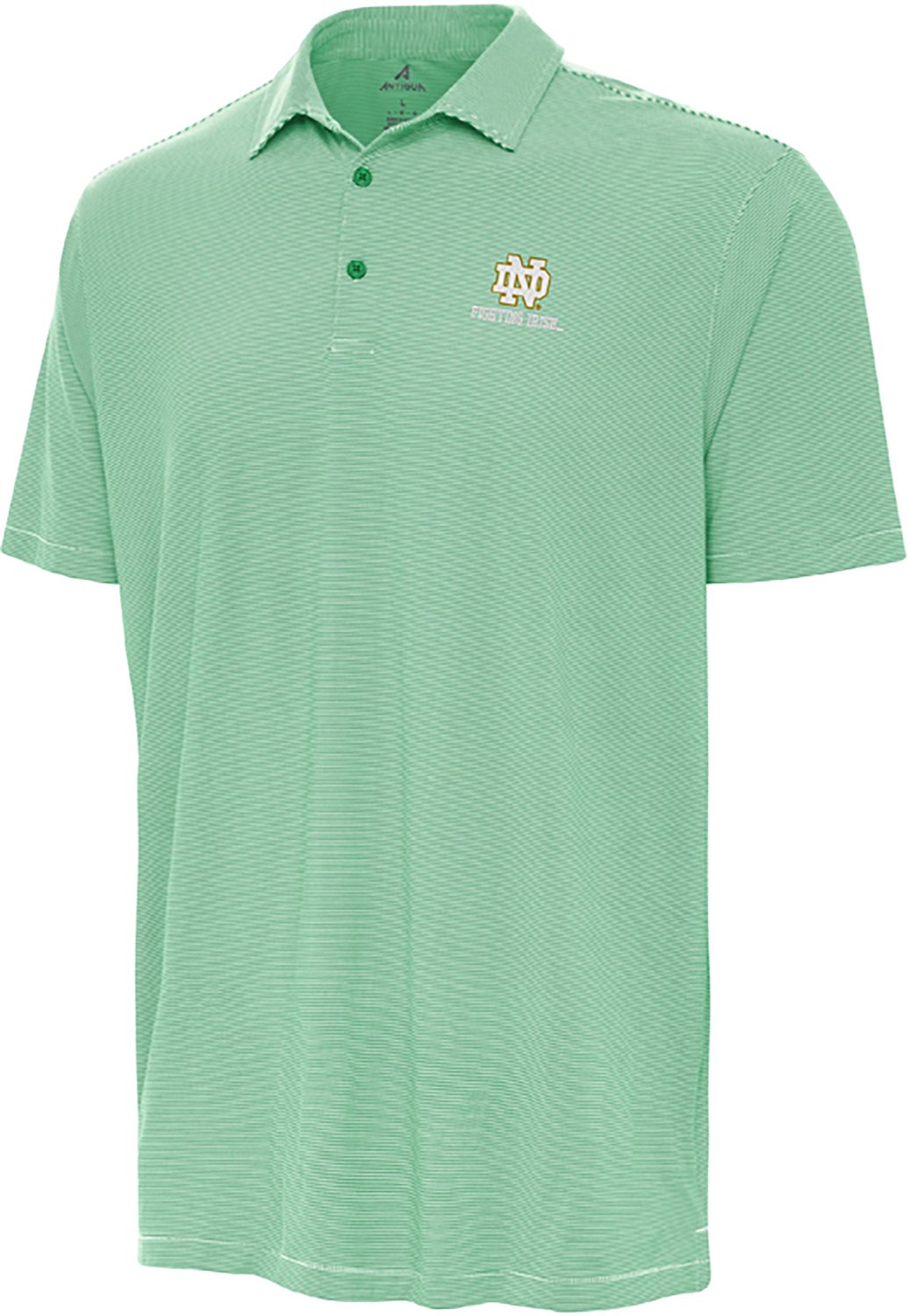 Root for your favorite team when you wear the Antigua Men's Notre Dame Fighting Irish Twine Polo. It is made of 92% polyester and 8% spandex. Its collar neckline creates a sophisticated look, and its side vents enhance breathability. The Notre Dame Fighting Irish logo shows off your team spirit.