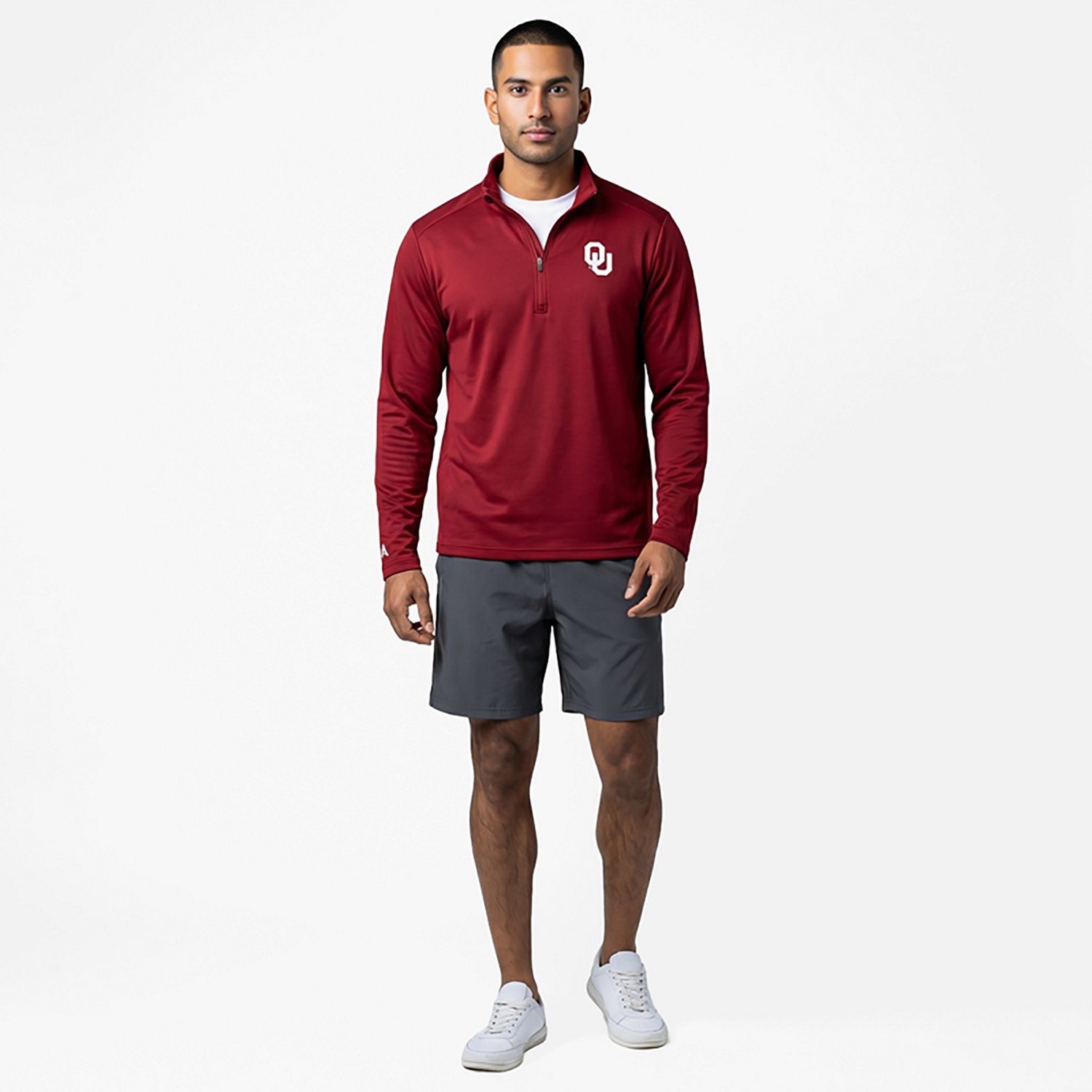 Support your team and get active in this Antigua Men's Oklahoma Sooners Tribute 1/4 Zip Pullover. It is made of 100% polyester jersey material for lightweight durability, and the pullover has open cuffs and an open hem for a relaxed look and feel. Features a team logo.