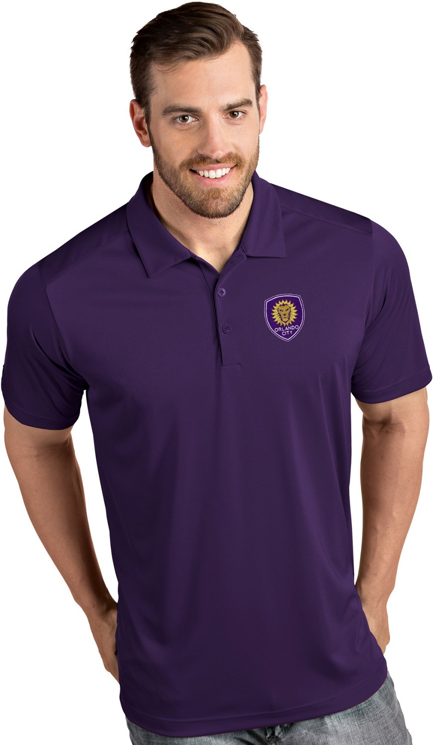 Cheer on OCSC in the Antigua Men's MLS Orlando City SC Tribute Polo. This soccer polo is made of a polyester-interlock knit that's comfortable, and is enhanced with Desert Dry™ technology to help keep you dry. The self-fabric collar and 3-button placket look great in the office or in the stands, and the team logo on the left chest adds a trendy look. For more team shirts and MLS gear, check out Academy.com.