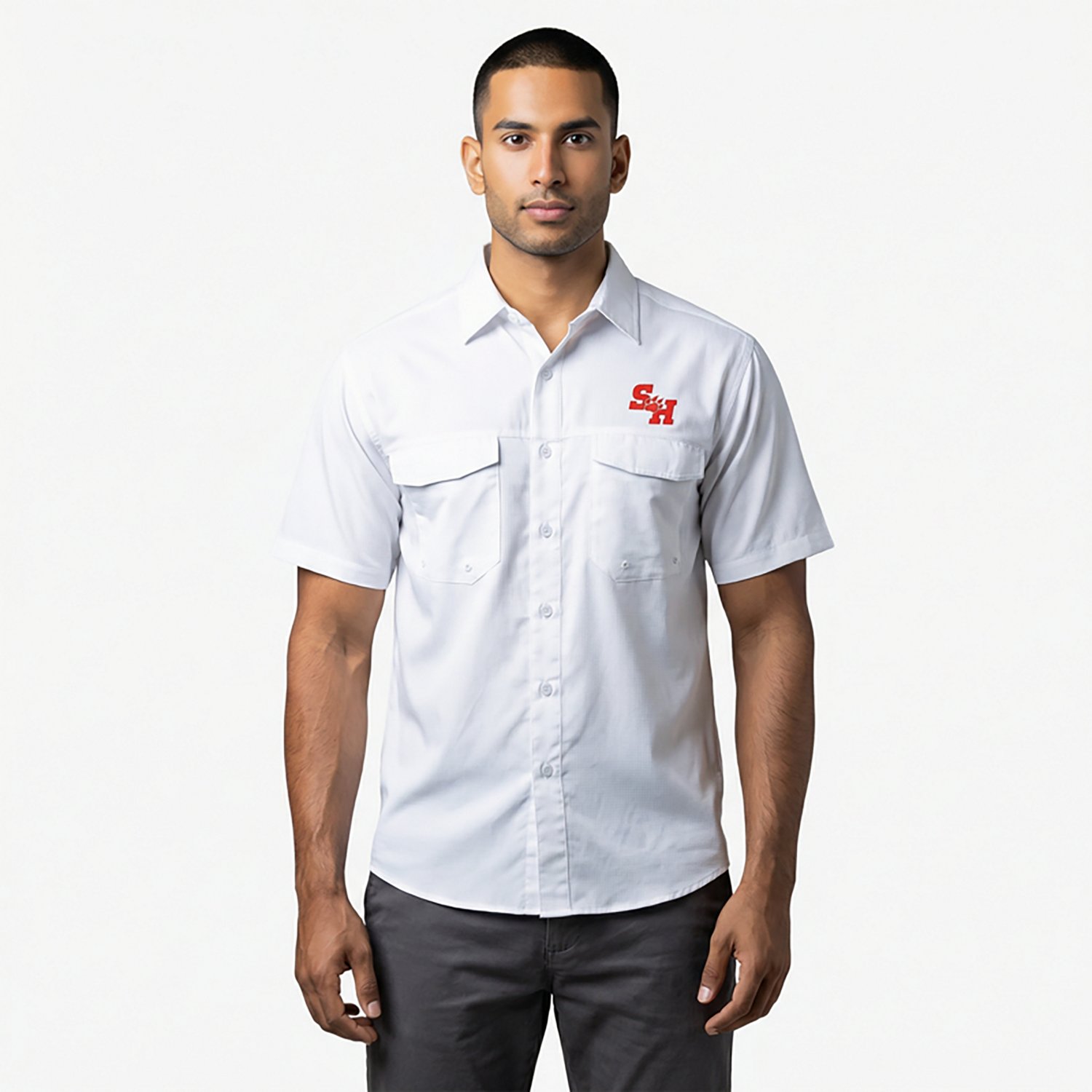 Stay fresh through a long day in the sun with the Antigua Men's Sam Houston State University Game Day Fishing Short Sleeve Shirt. The 100% polyester weave stands up to wear and tear while protecting you from UV exposure. The split back yoke provides extra ventilation, while the embroidered logo displays your Bearkats fandom.