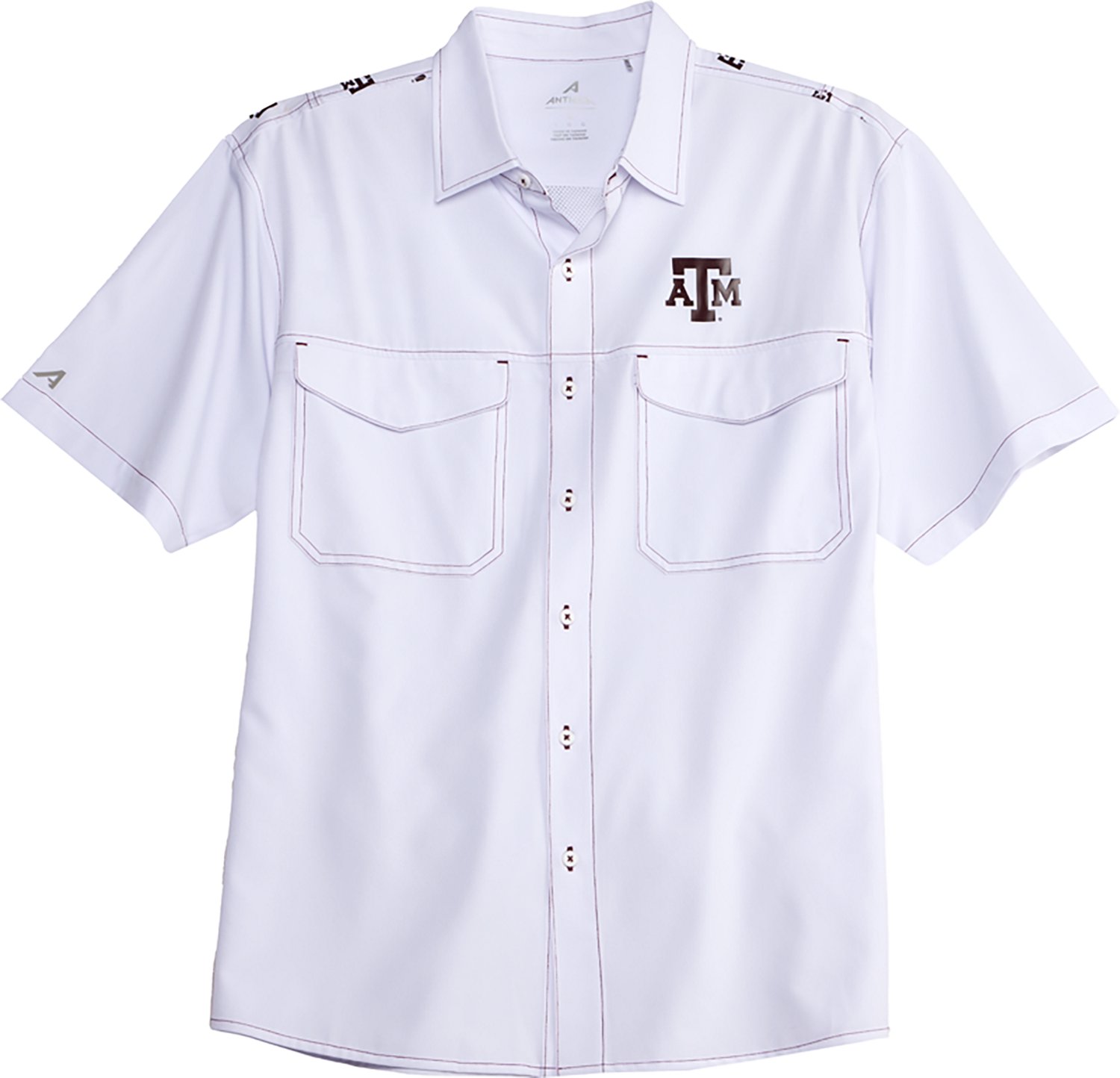 Wear your team colors with pride in the Antigua Men's Texas A&M University Scatter Print Button Down Shirt. The polyester and spandex material provides a comfortable feel, while the UPF 50+ sun protection shields against harmful UV rays. The split back yoke offers breathability, and the team branding shows off your Aggies spirit.