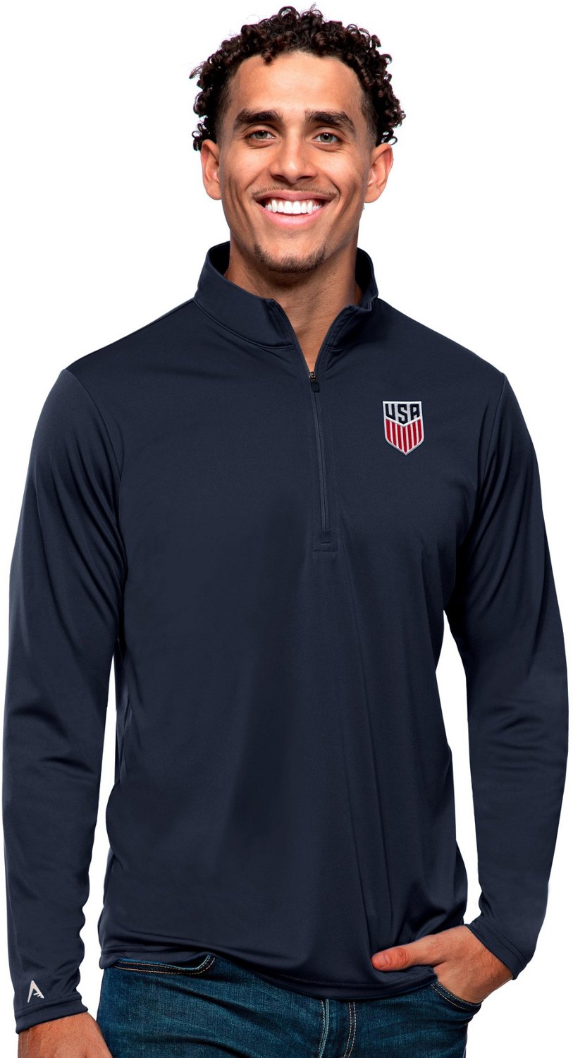 Head out wearing the Antigua Men's USA Tribute 1/4-Zip Pullover. This pullover features a 100% polyester interlock knit construction for all-day comfort. The UPF 50+ technology guards against harmful sun rays.