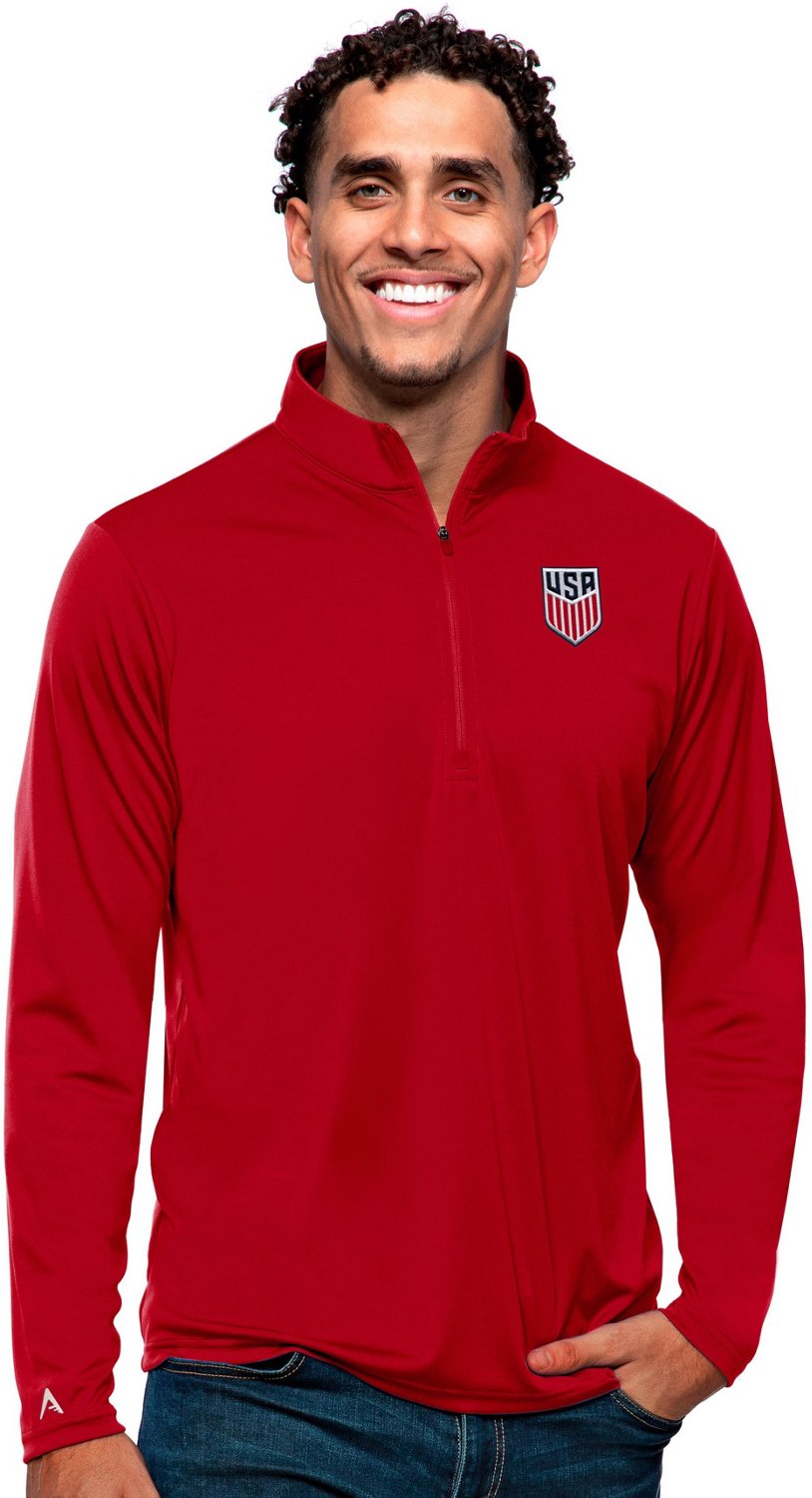 Head out wearing the Antigua Men's USA Tribute 1/4-Zip Pullover. This pullover features a 100% polyester interlock knit construction for all-day comfort. The UPF 50+ technology guards against harmful sun rays.