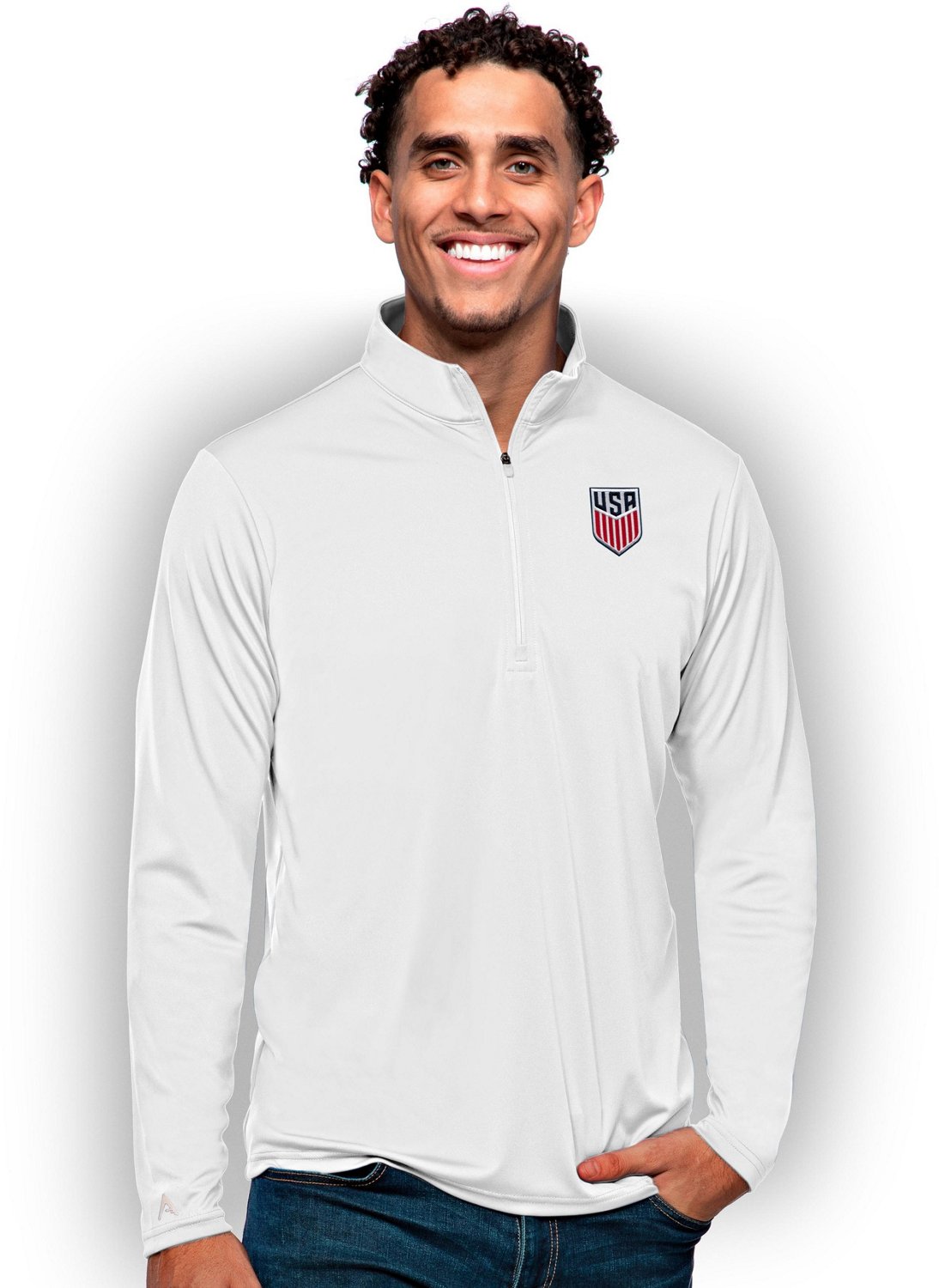 Head out wearing the Antigua Men's USA Tribute 1/4-Zip Pullover. This pullover features a 100% polyester interlock knit construction for all-day comfort. The UPF 50+ technology guards against harmful sun rays.